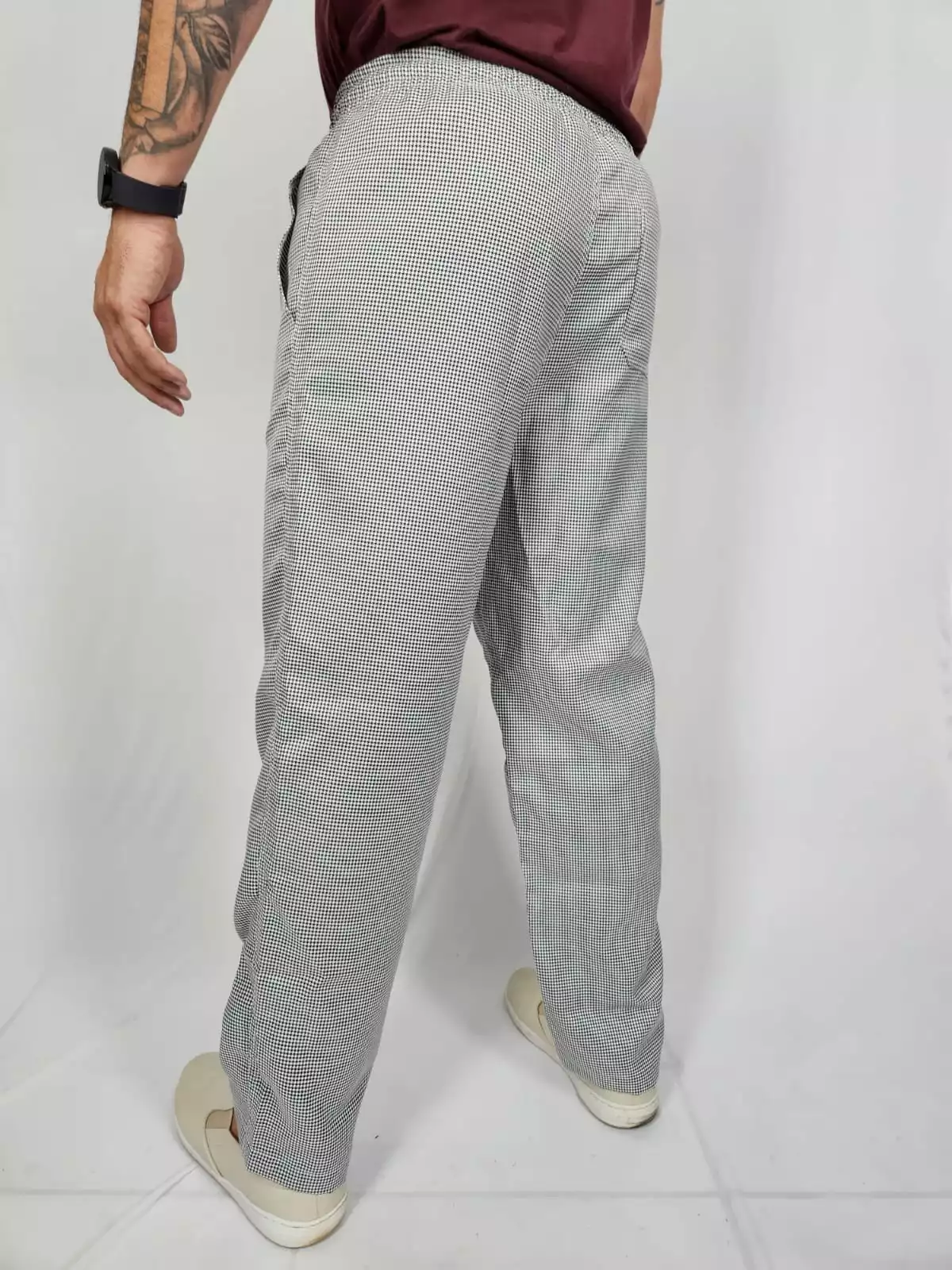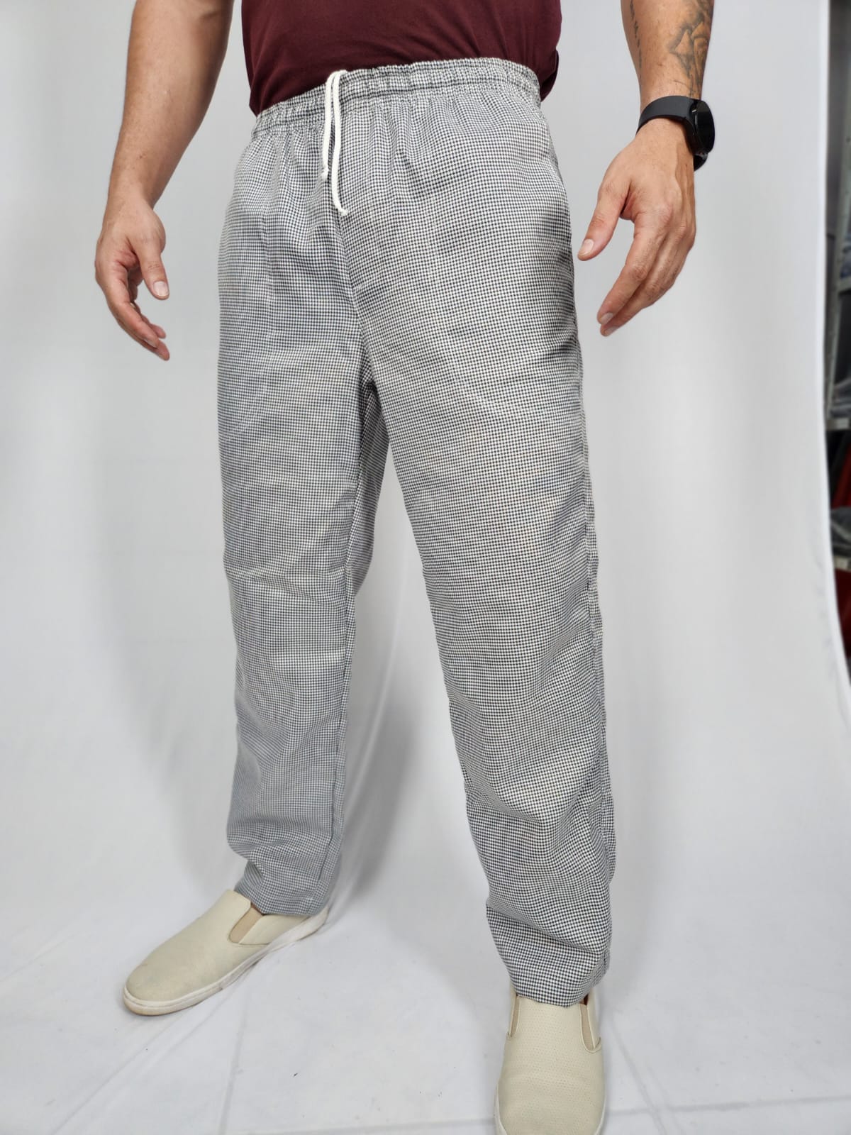 Calça profissional em tecido pe de pule xadrez, cos de elástico com cordinha. Bolso faca.