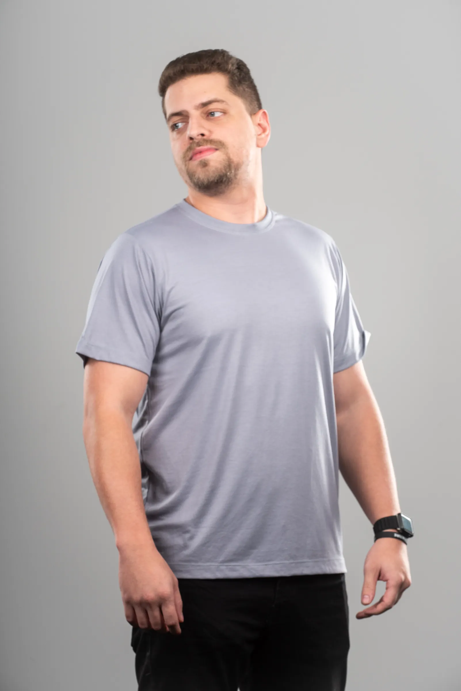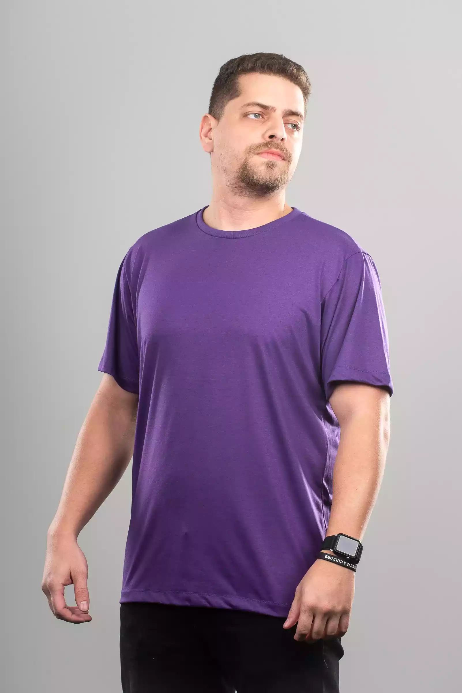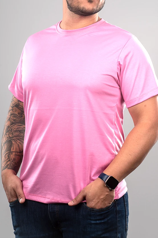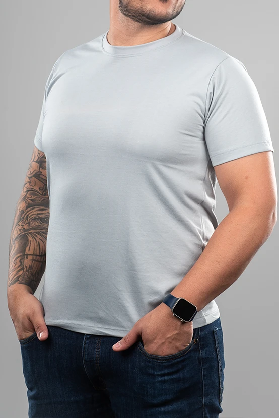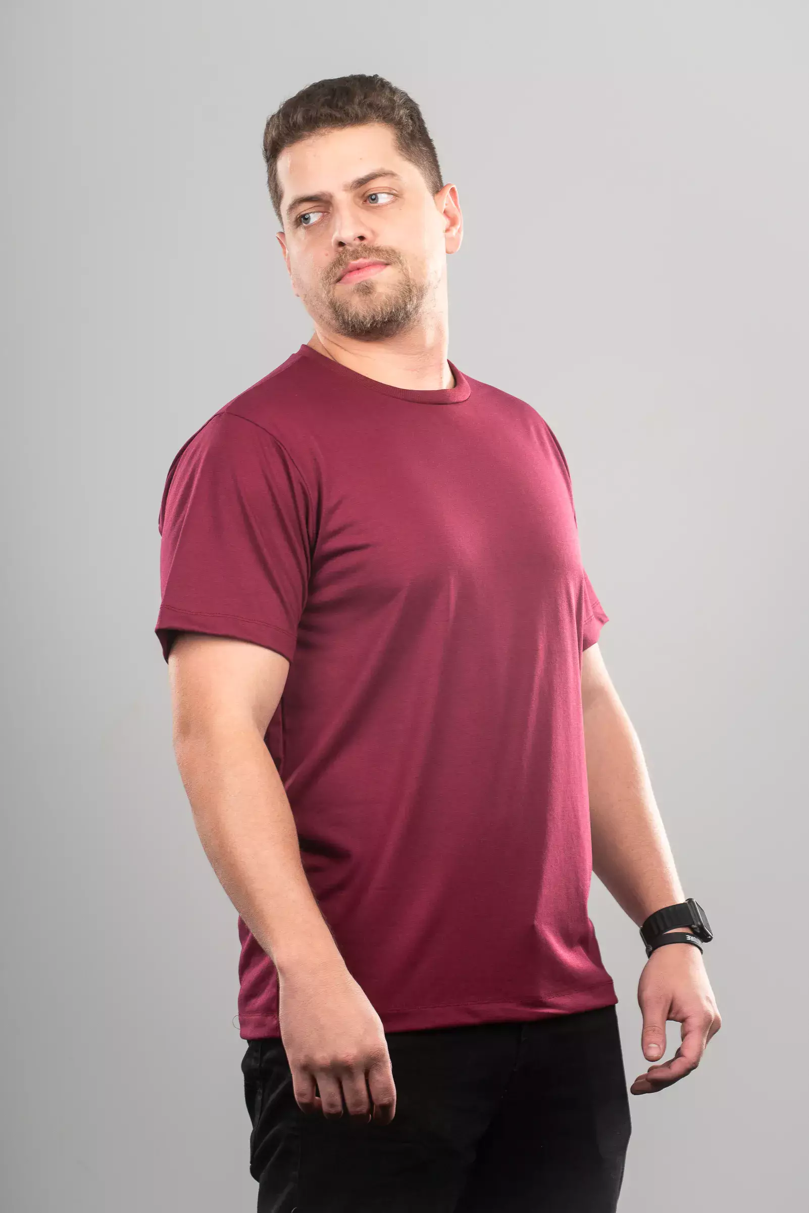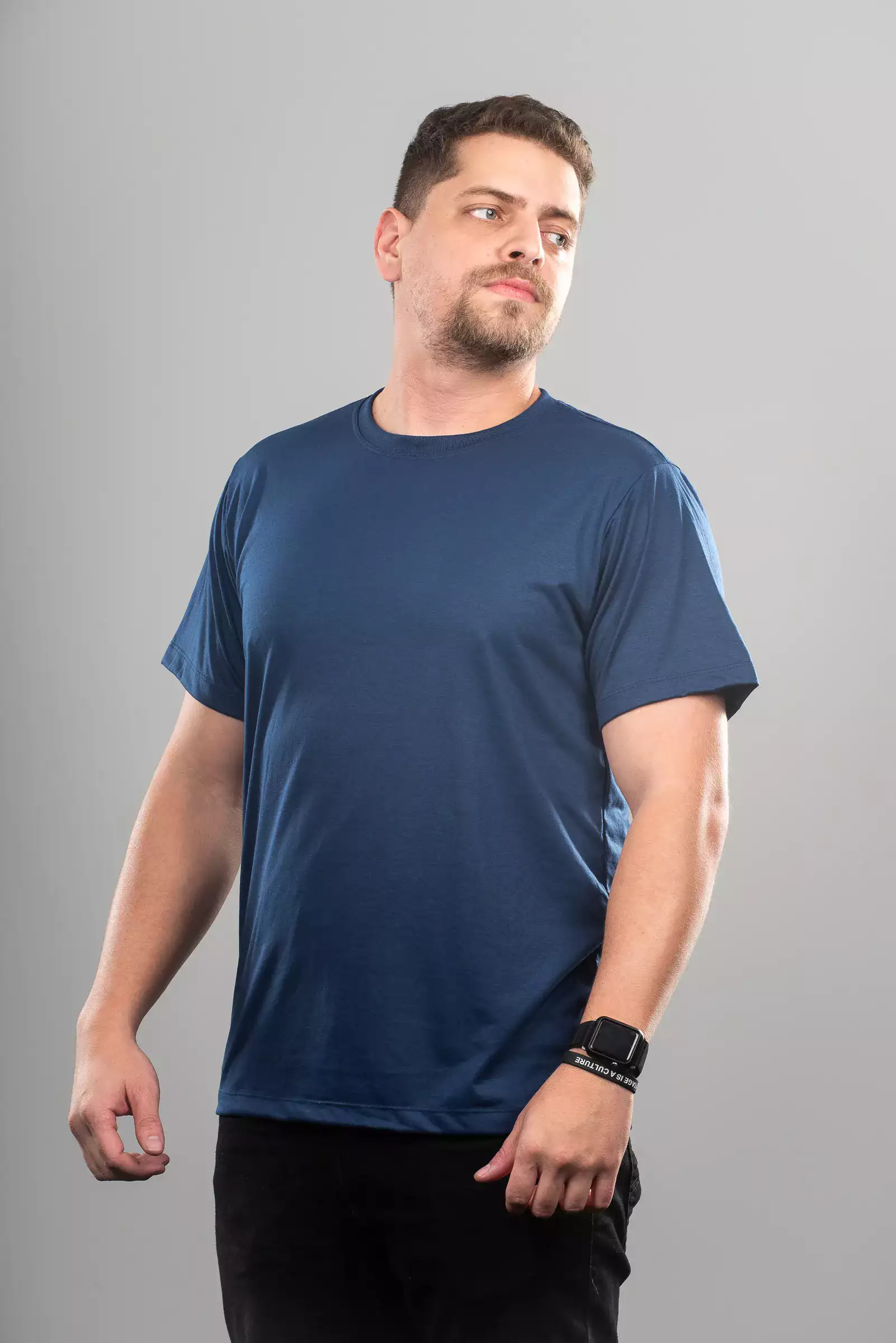 Camiseta básica em malha fria antipilling, manga curta, gola redonda.