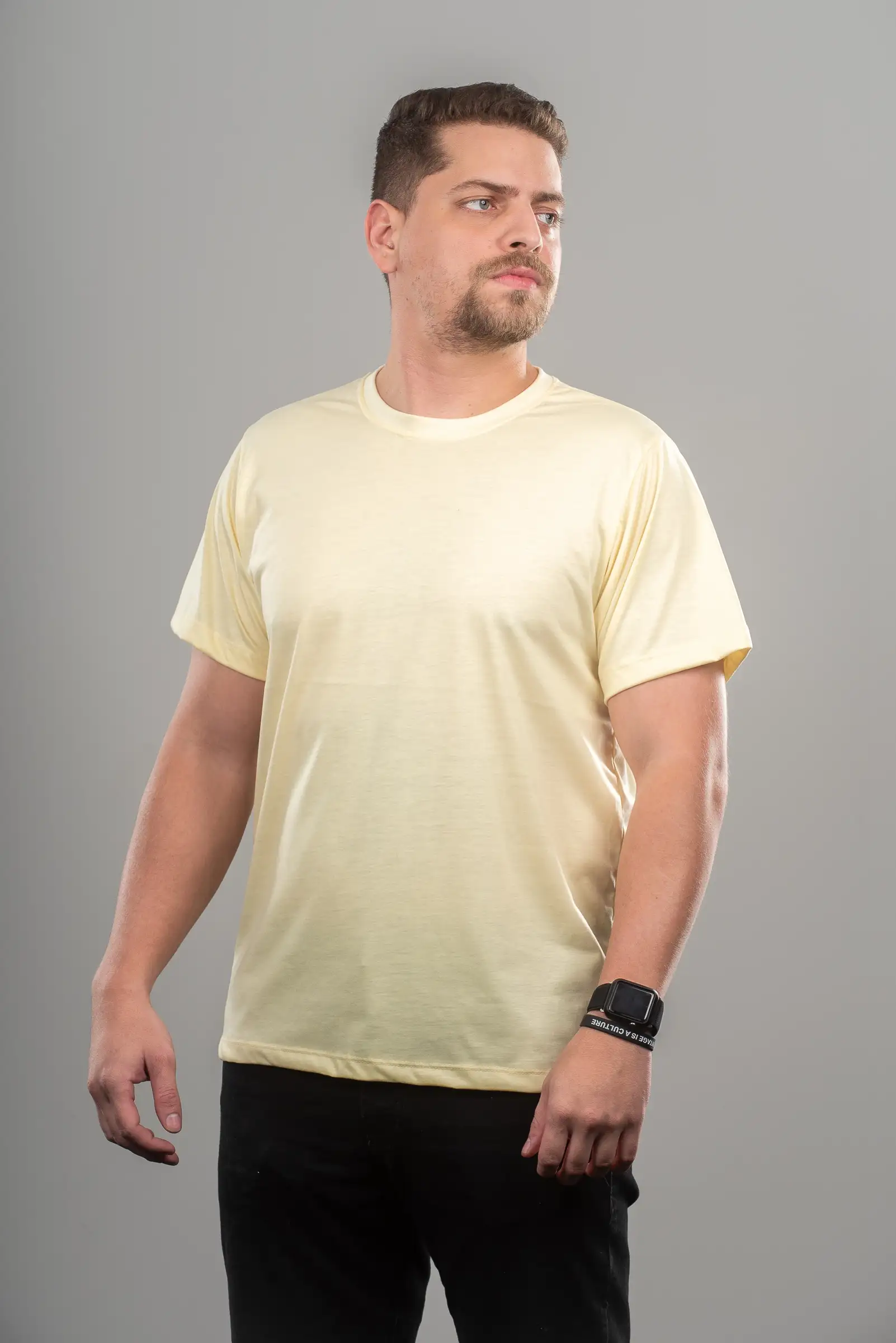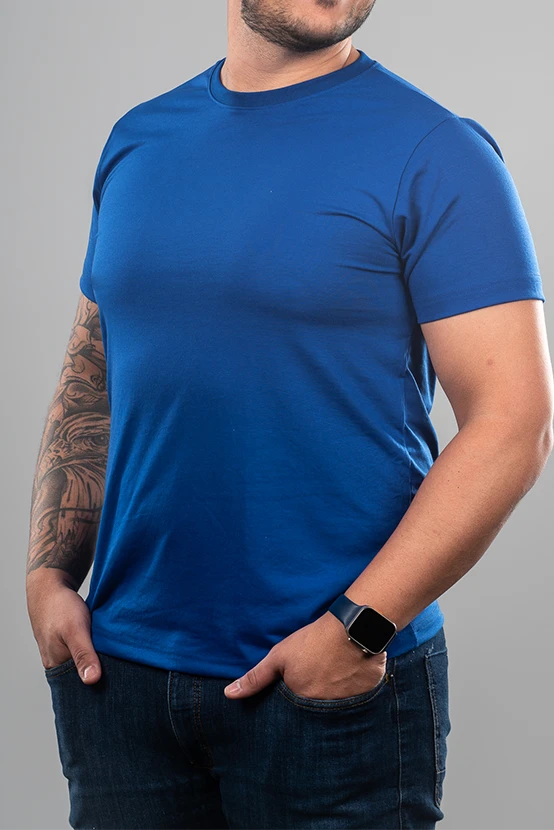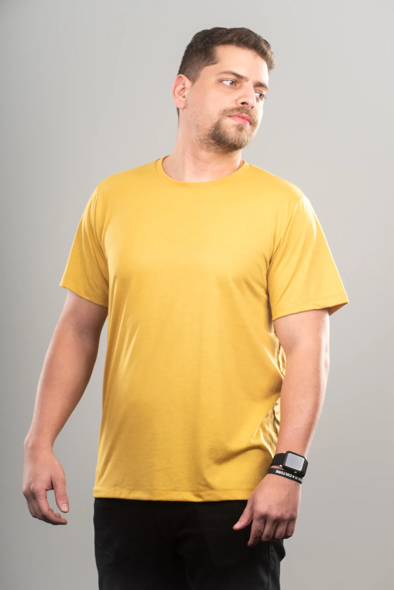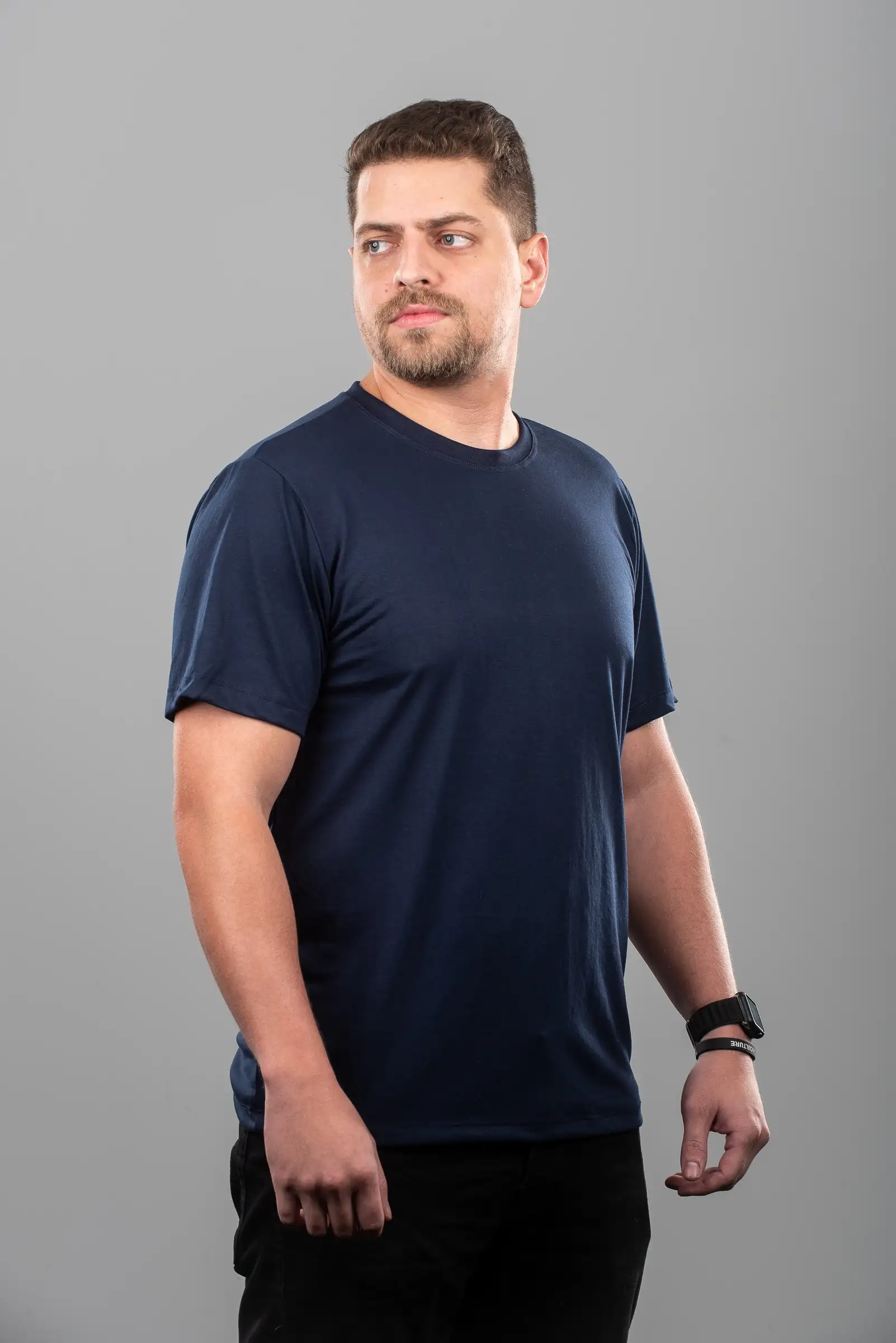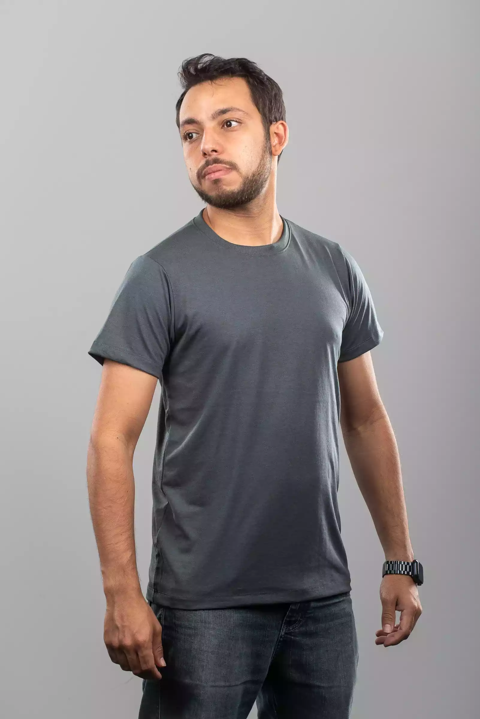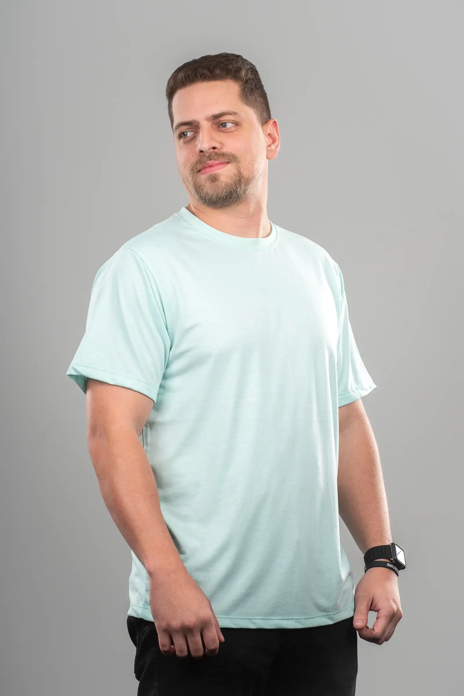 Camiseta básica em malha fria antipilling, manga curta, gola redonda.