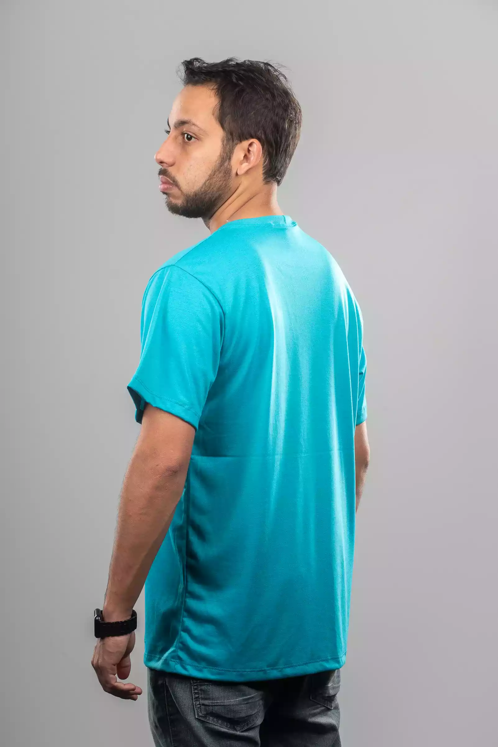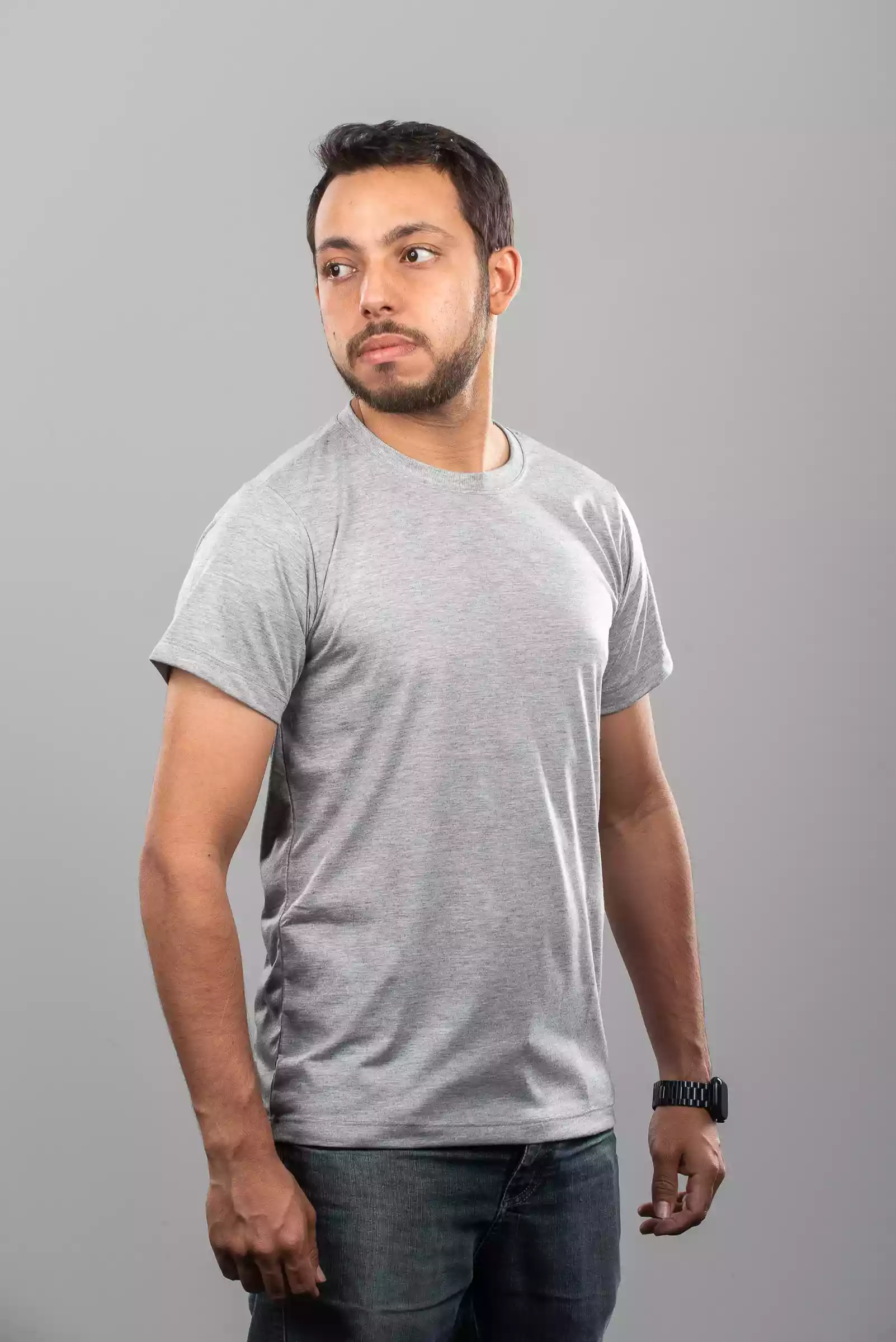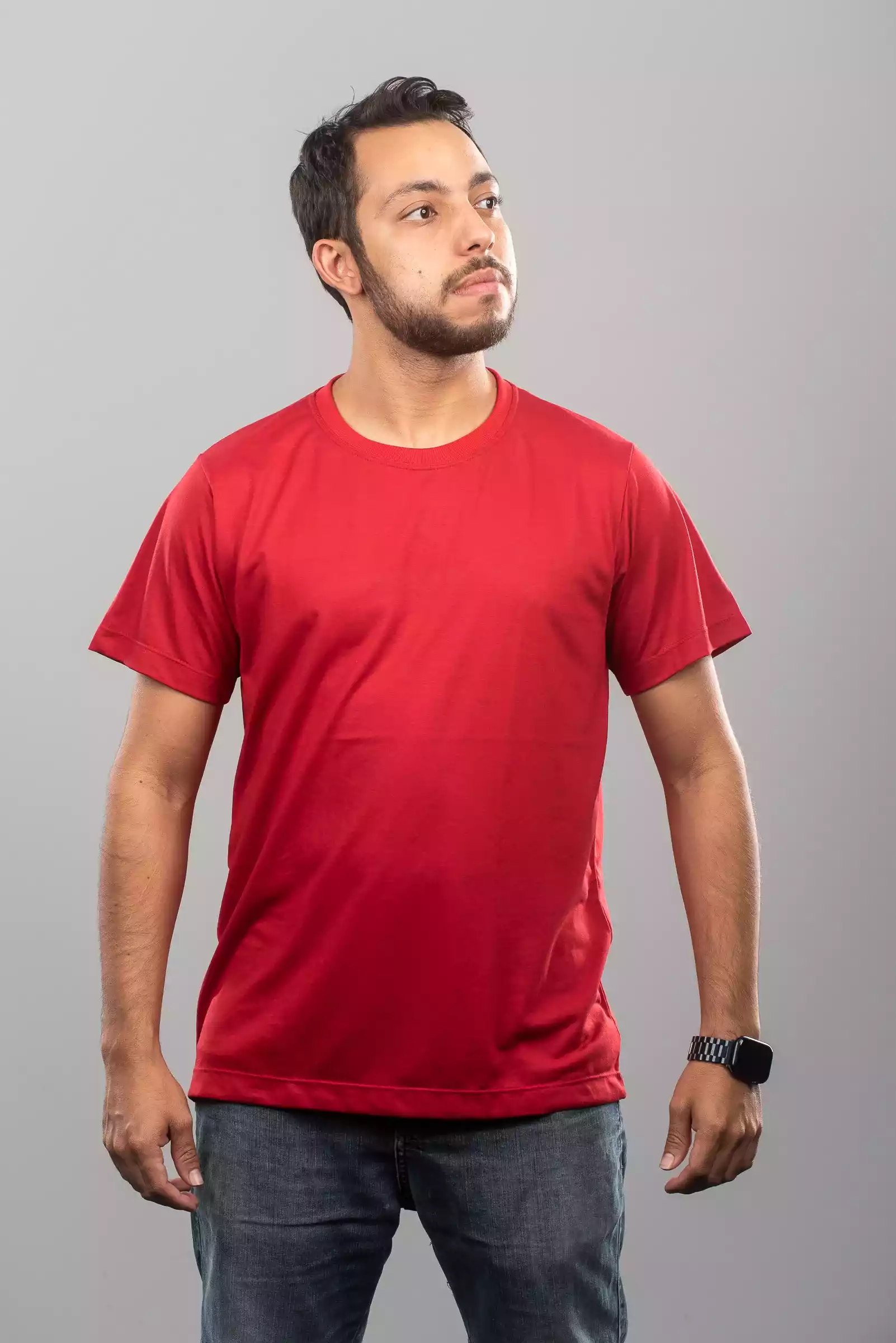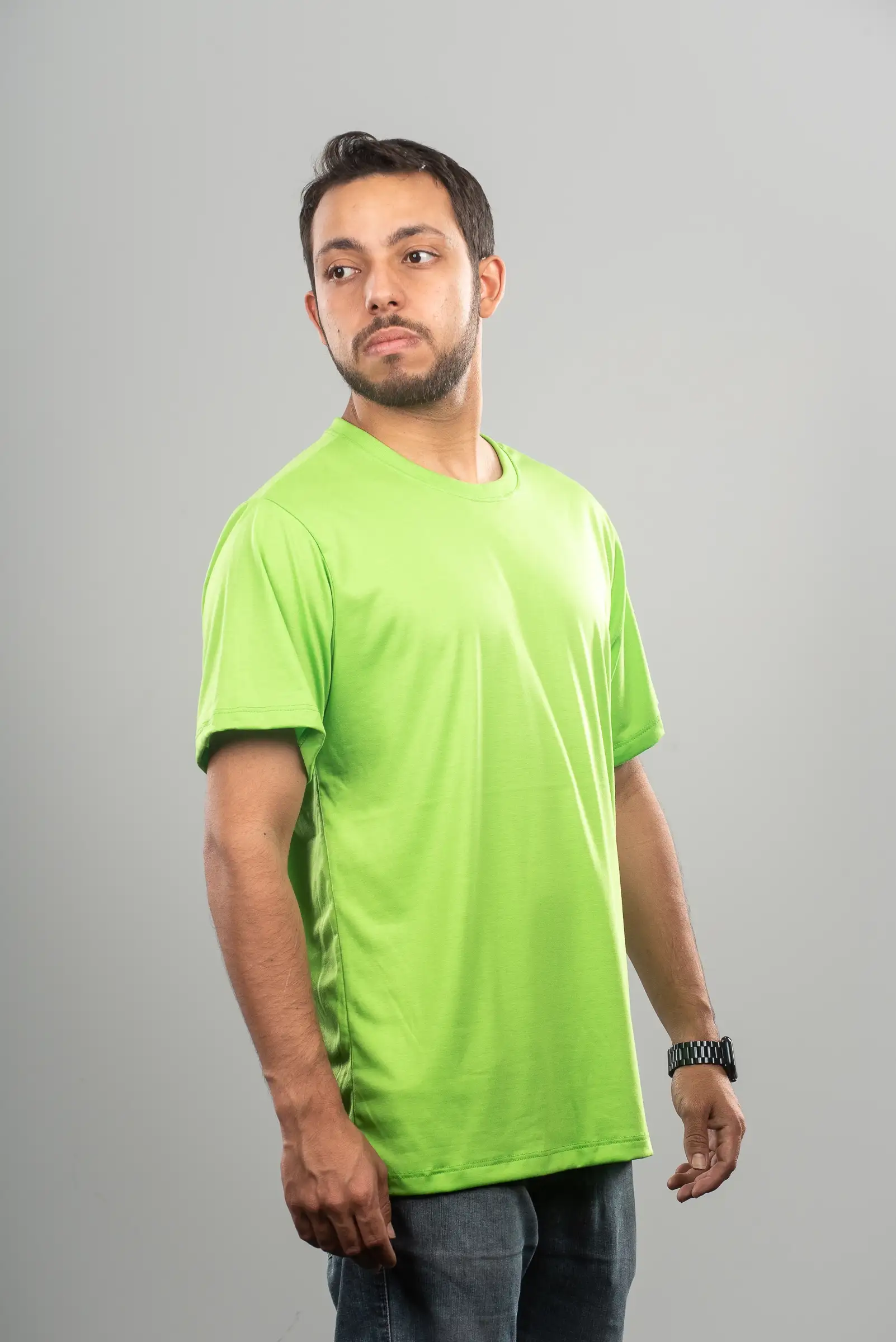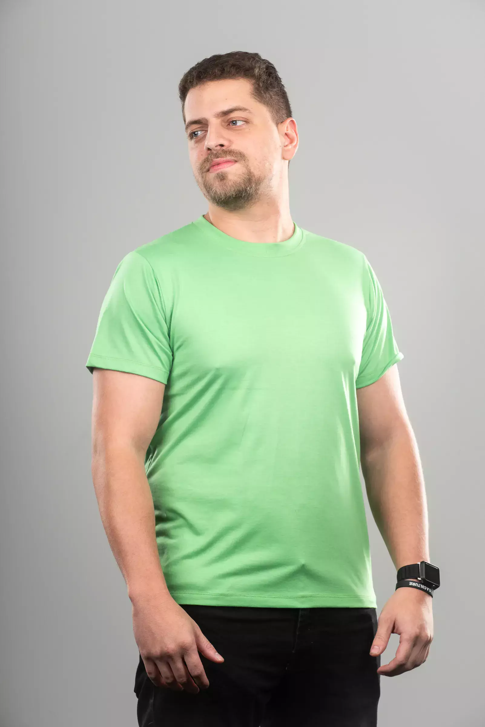 Camiseta básica em malha fria antipilling, manga curta, gola redonda.