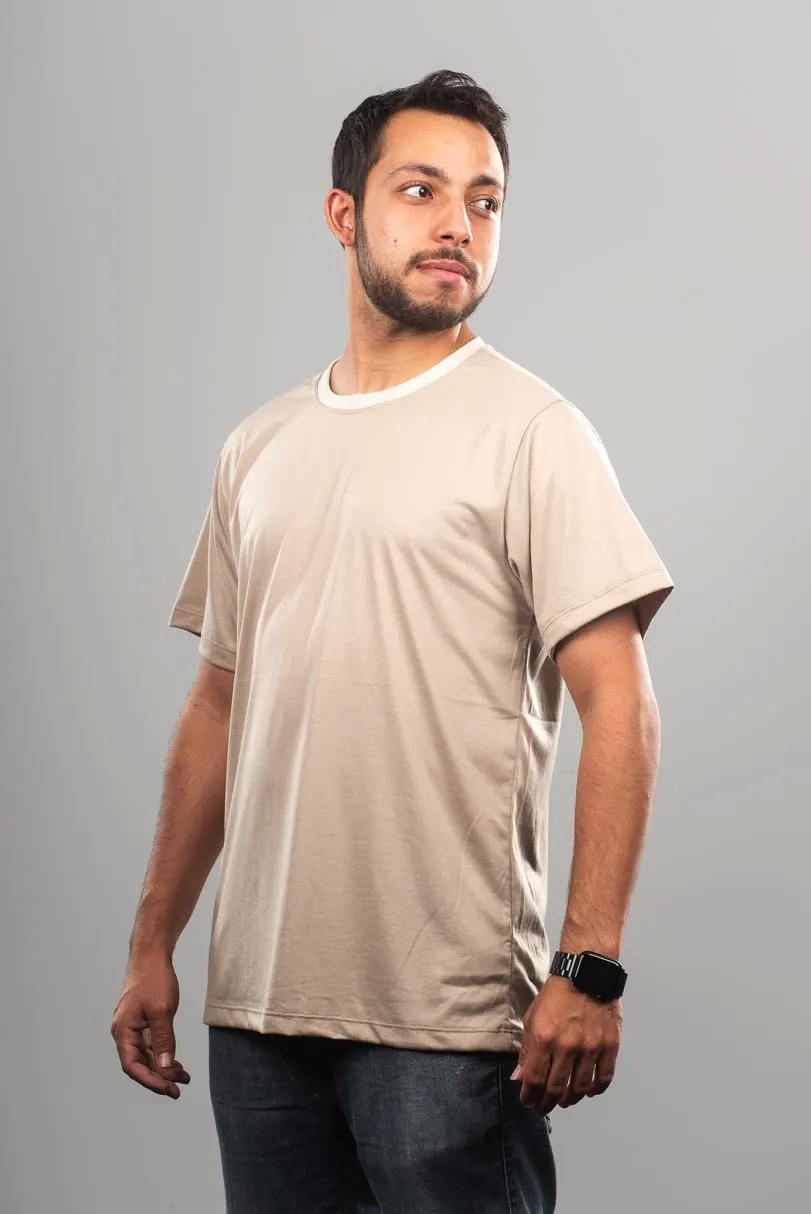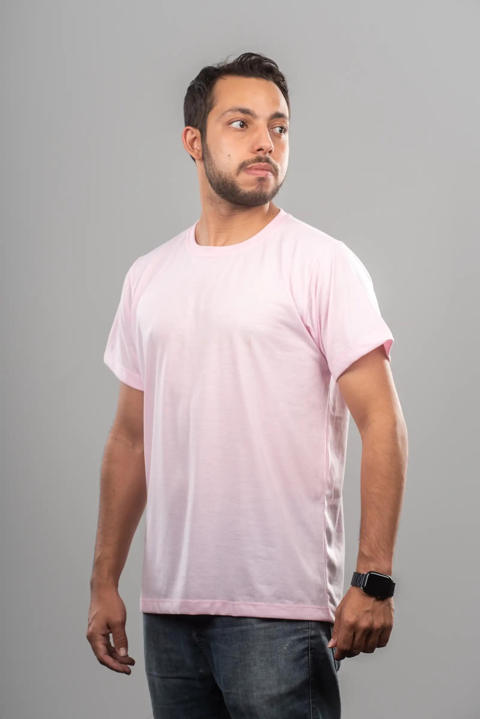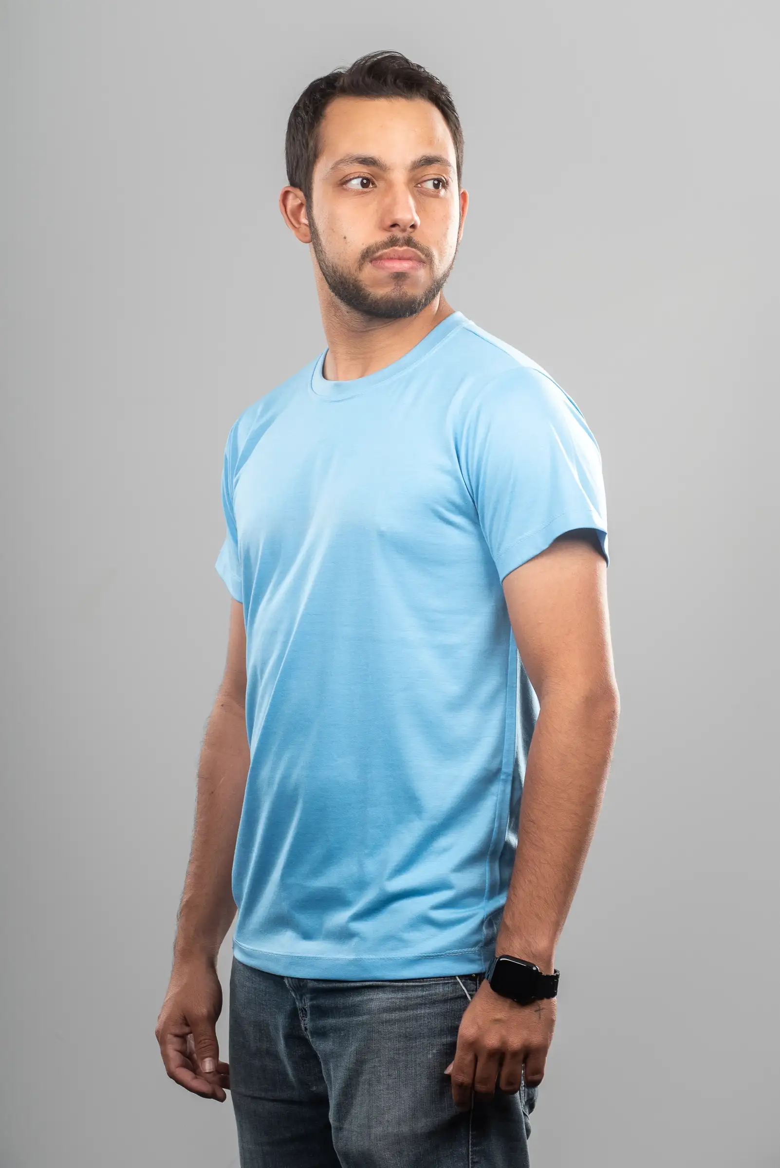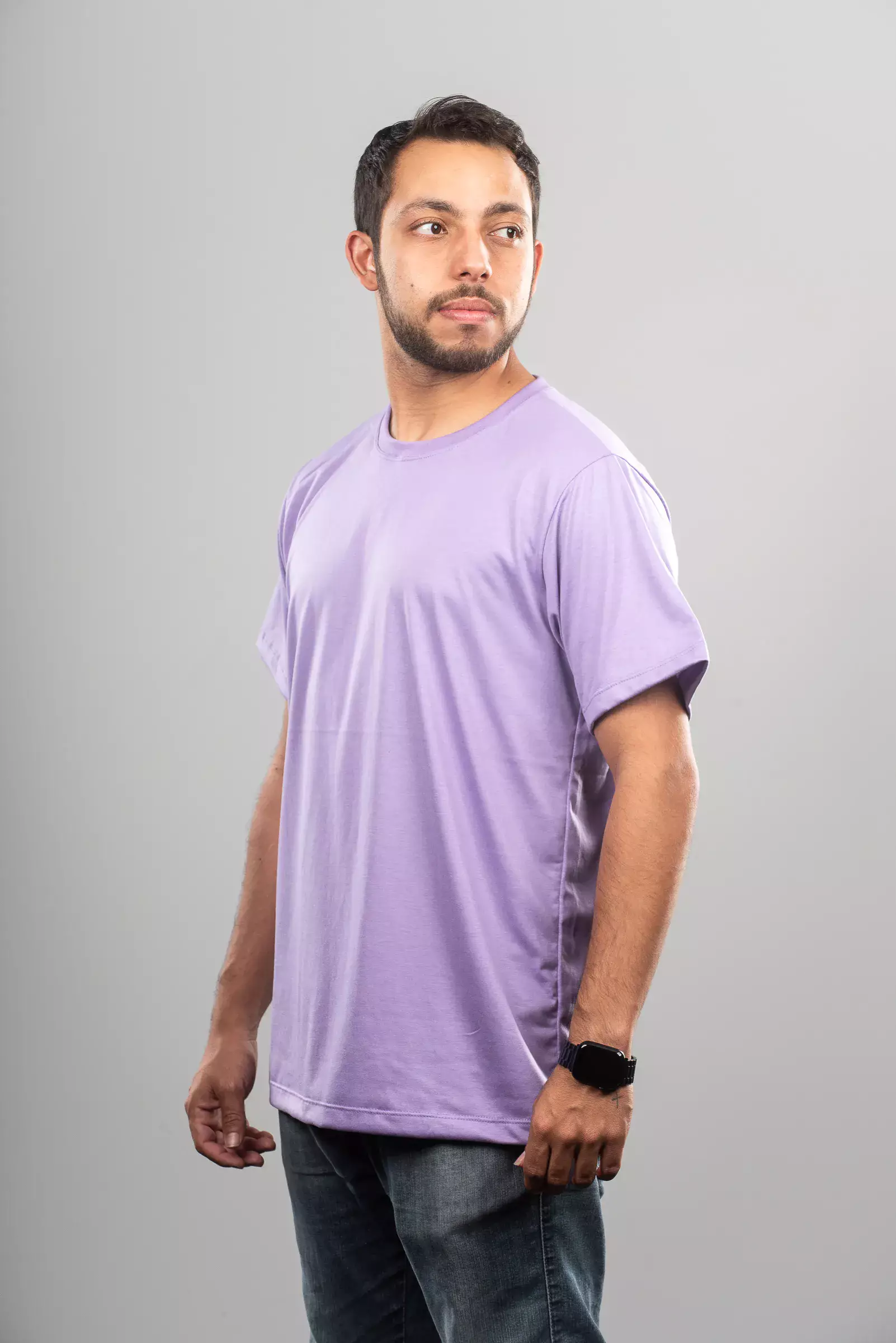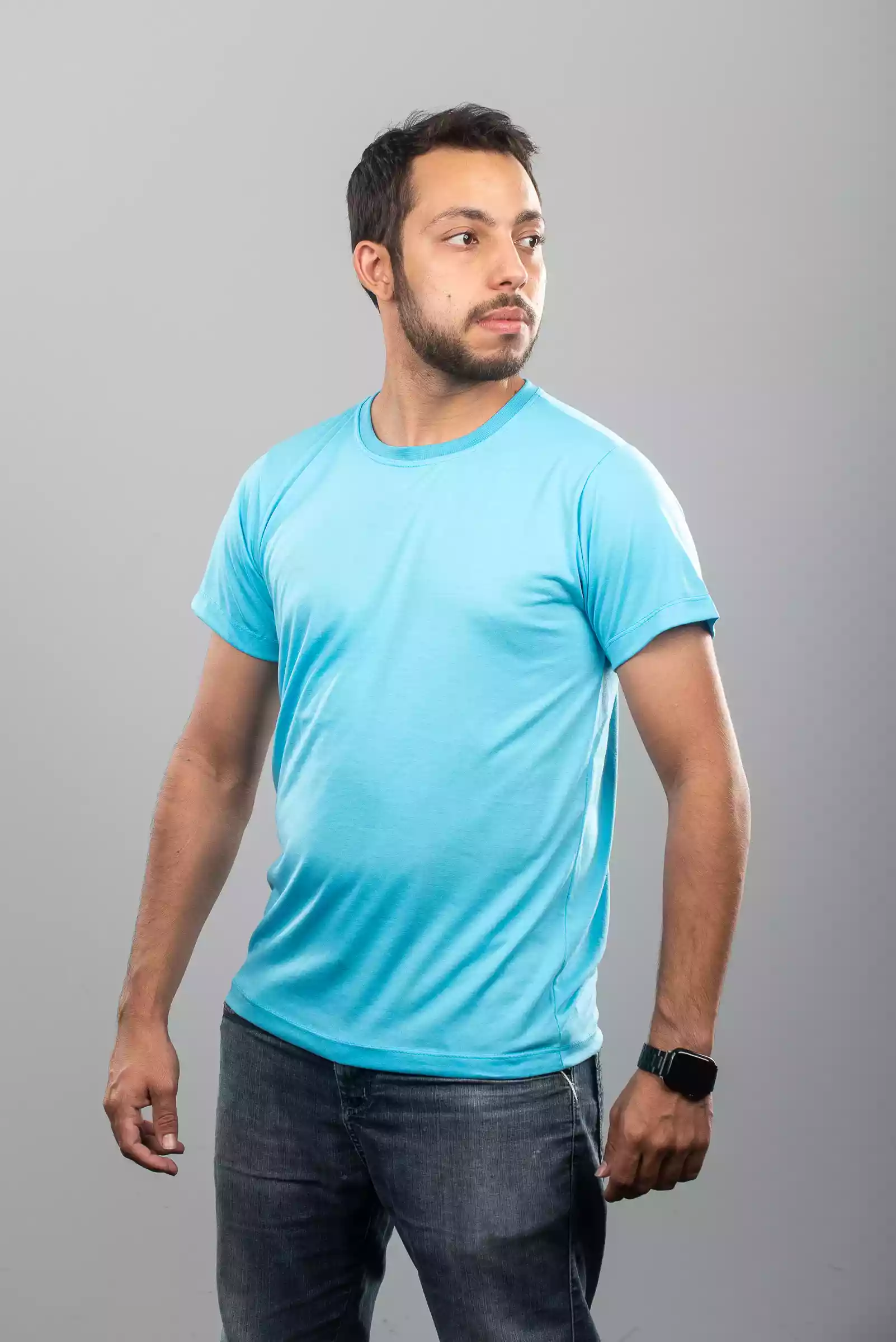 Camiseta básica em malha fria antipilling, manga curta, gola redonda.