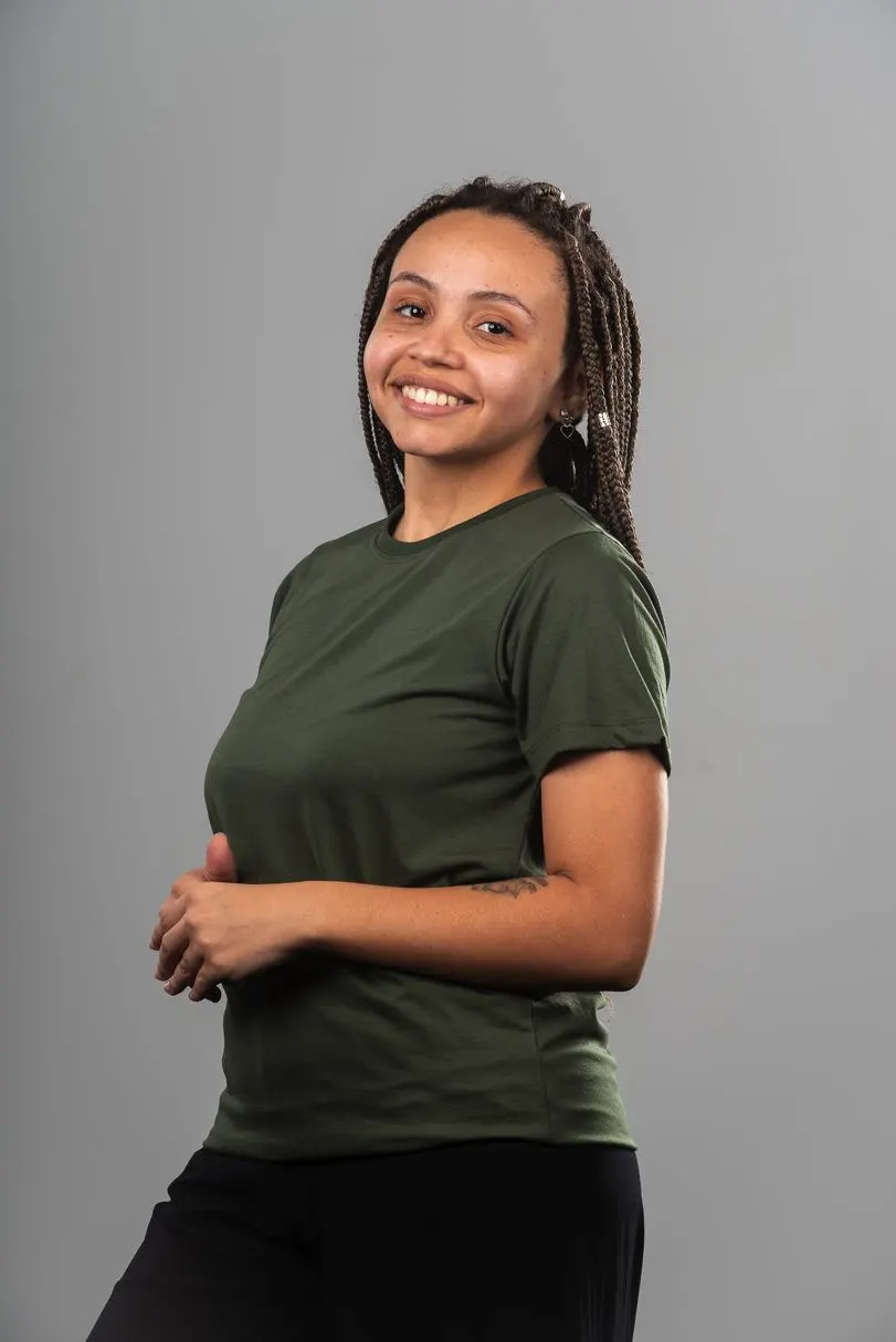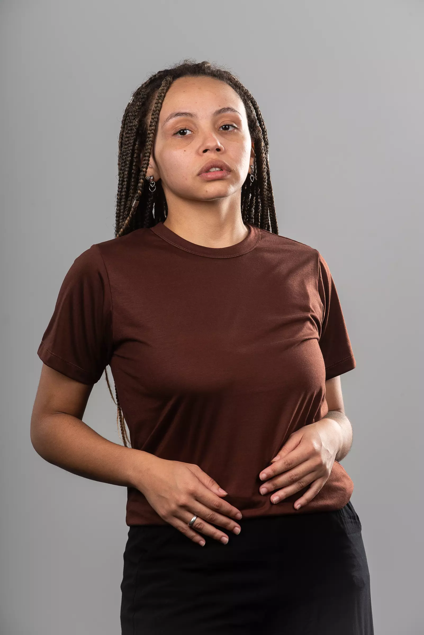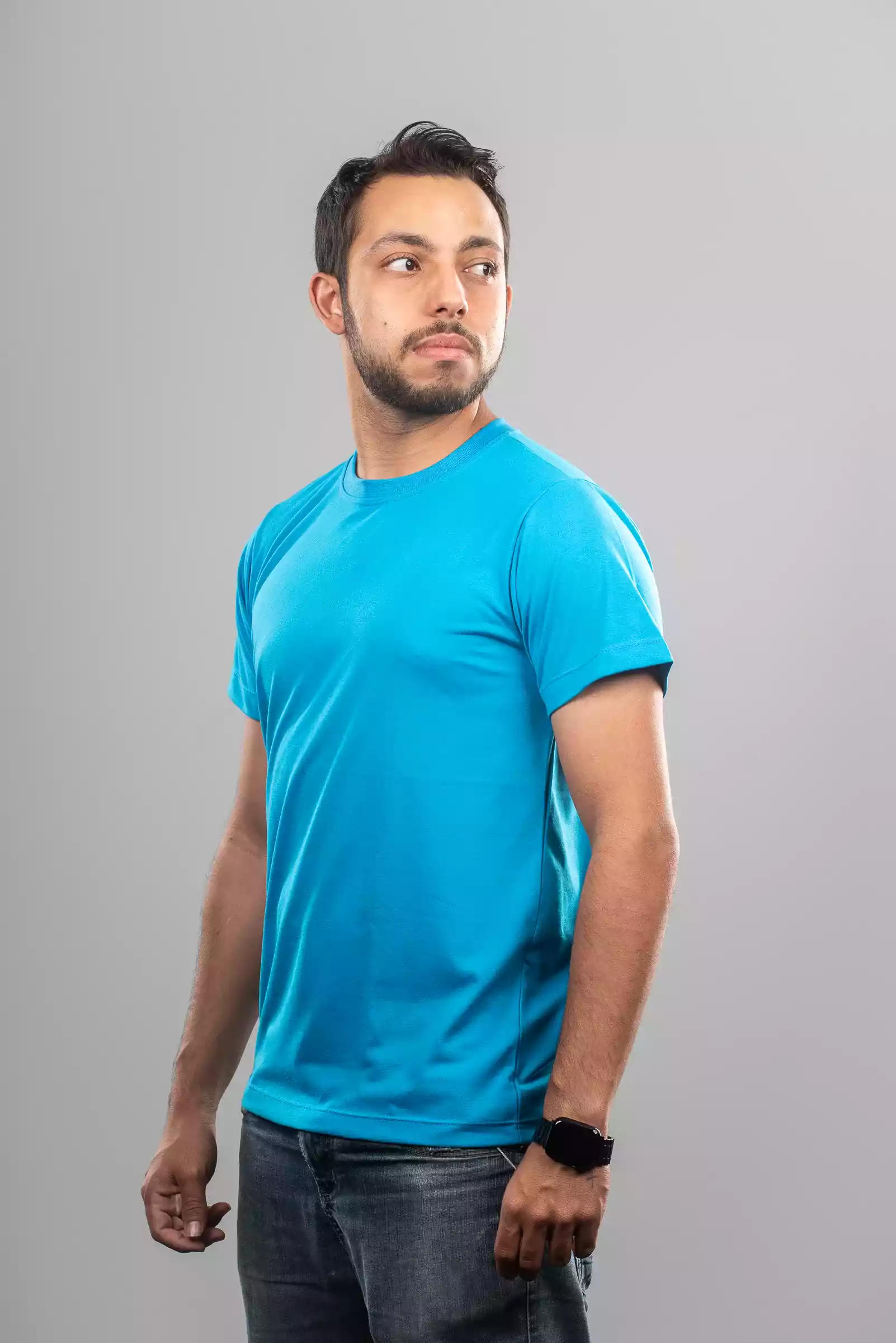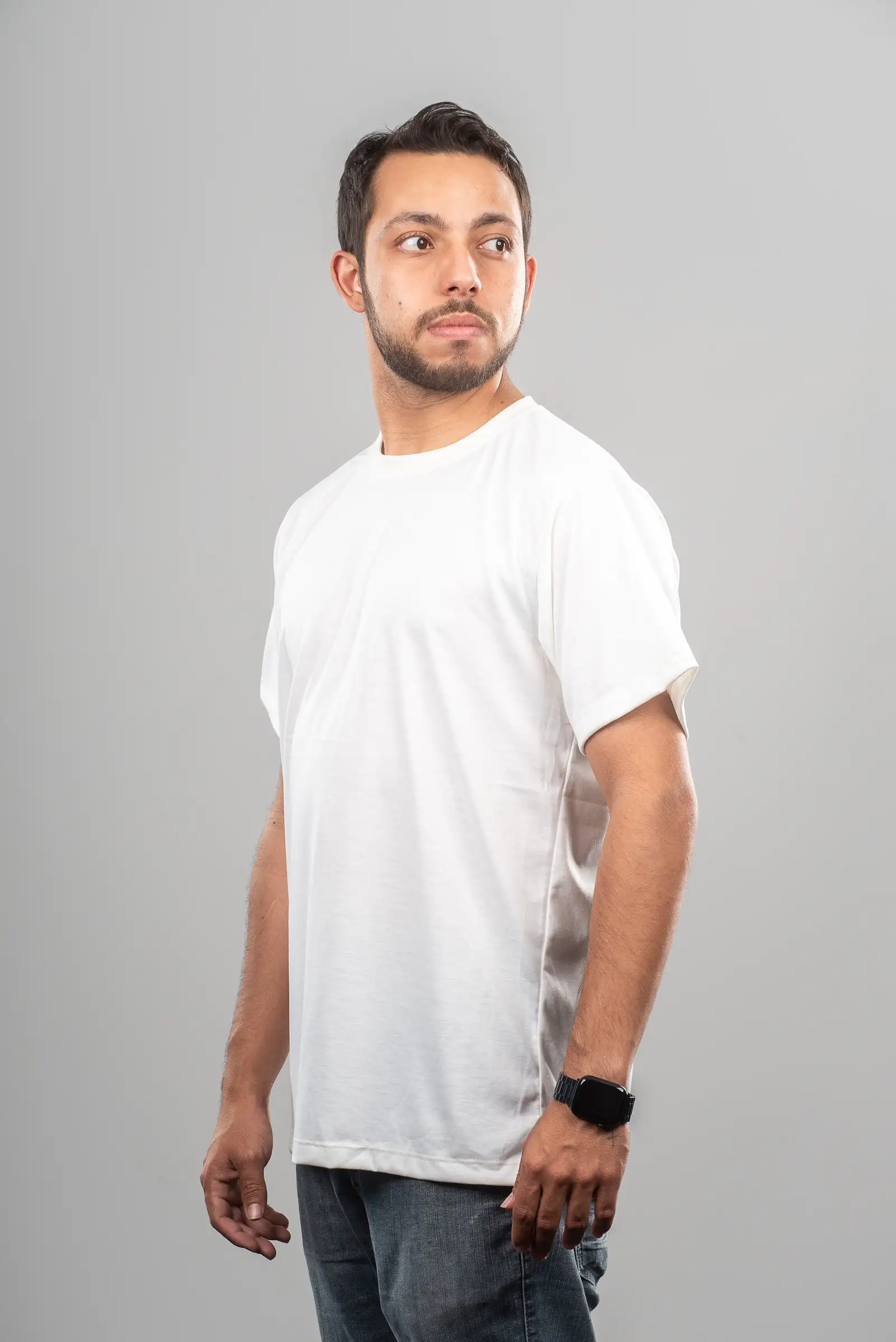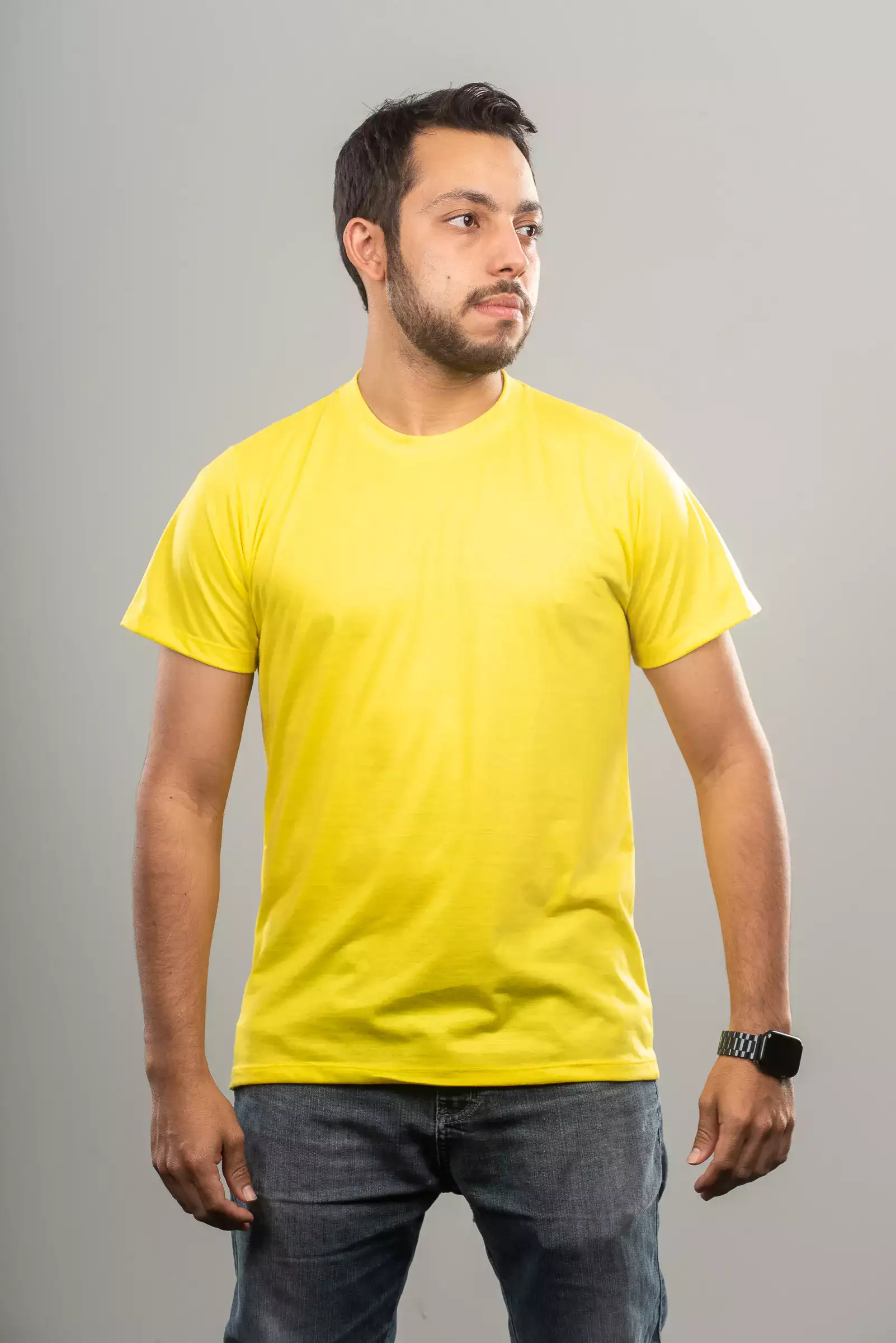 Camiseta básica em malha fria antipilling, manga curta, gola redonda.