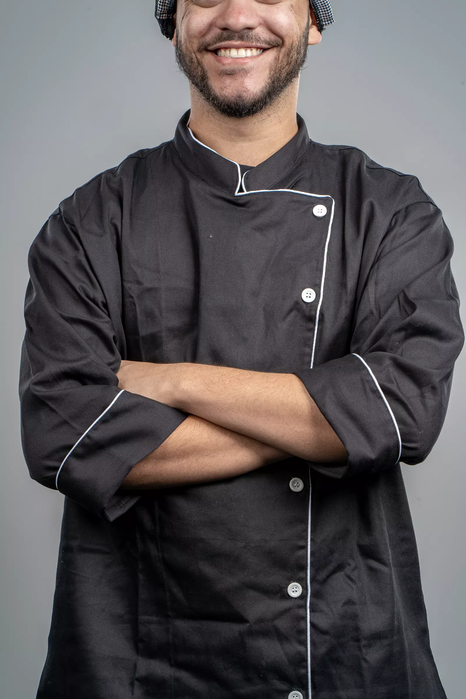 Dolmã de cozinha feita de tecido 100% algodão. Manga 3/4. Detalhe botões e friso.