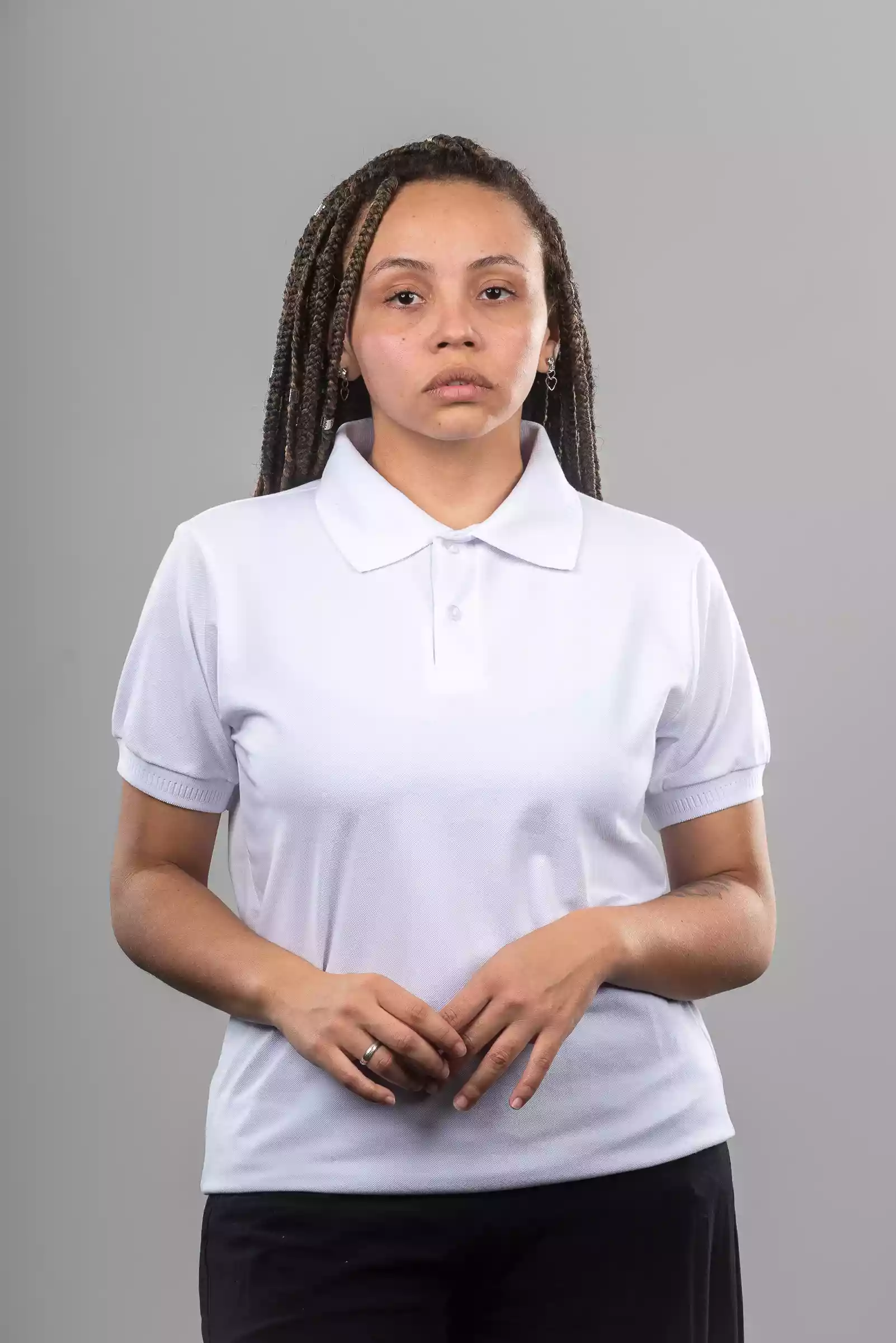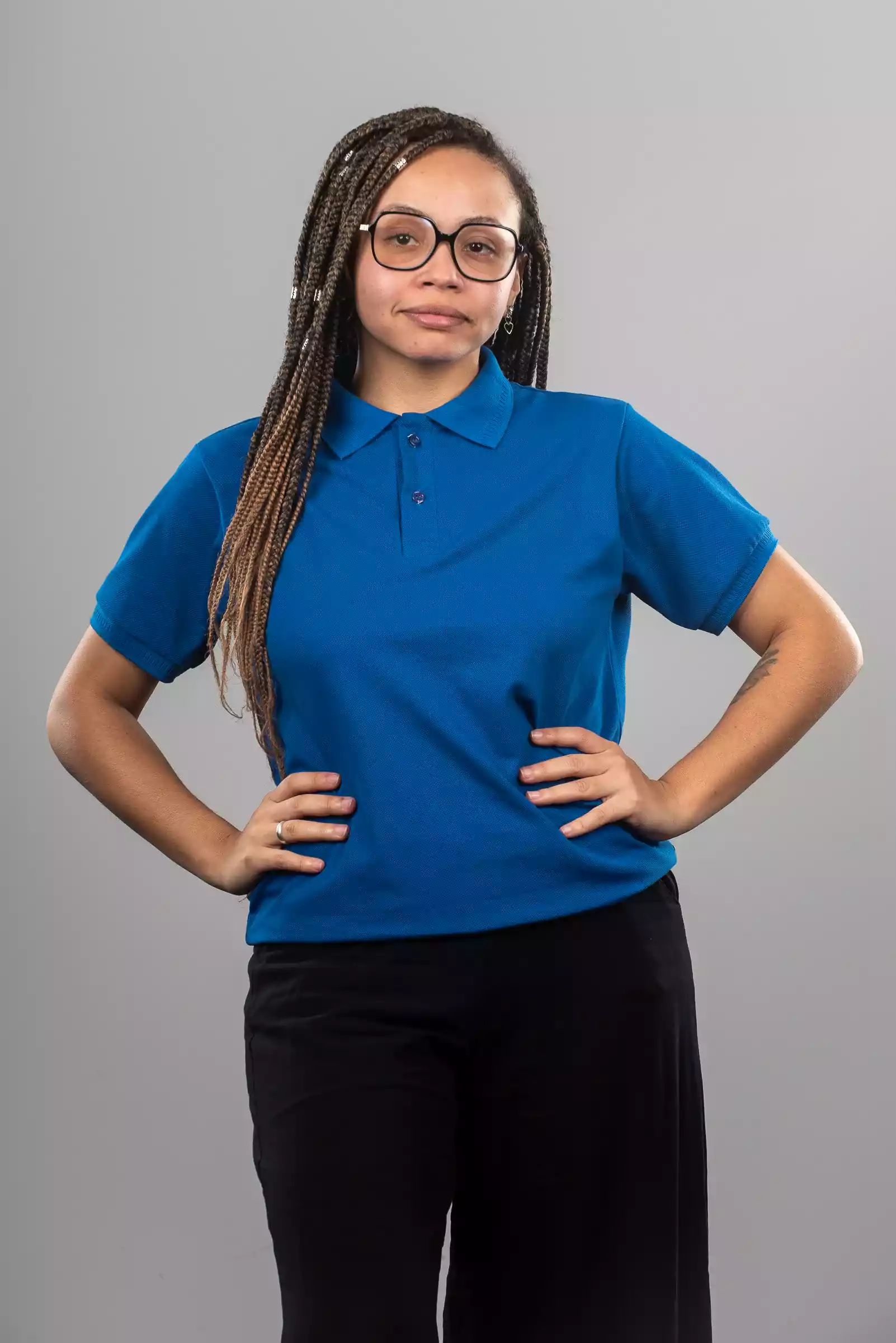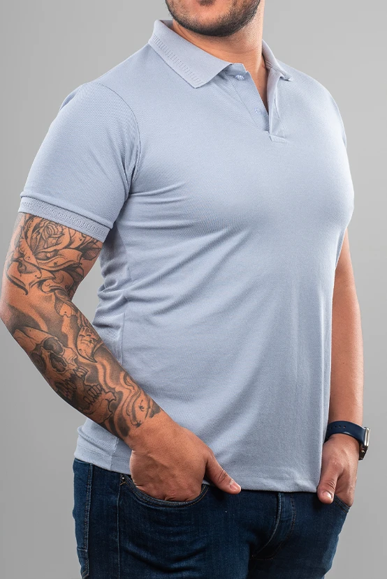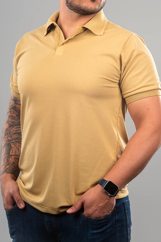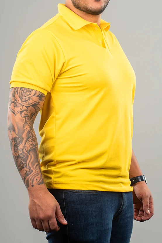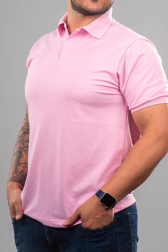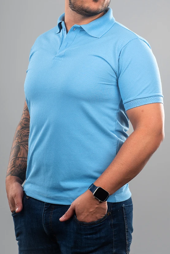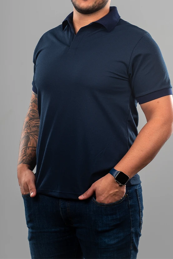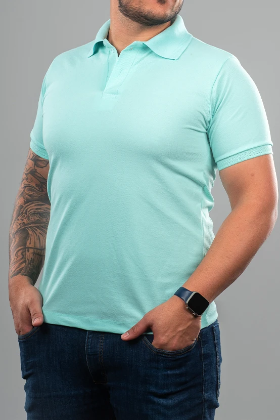 Gola polo basica, malha piquet caiman, manga curta com gola e punho misto.