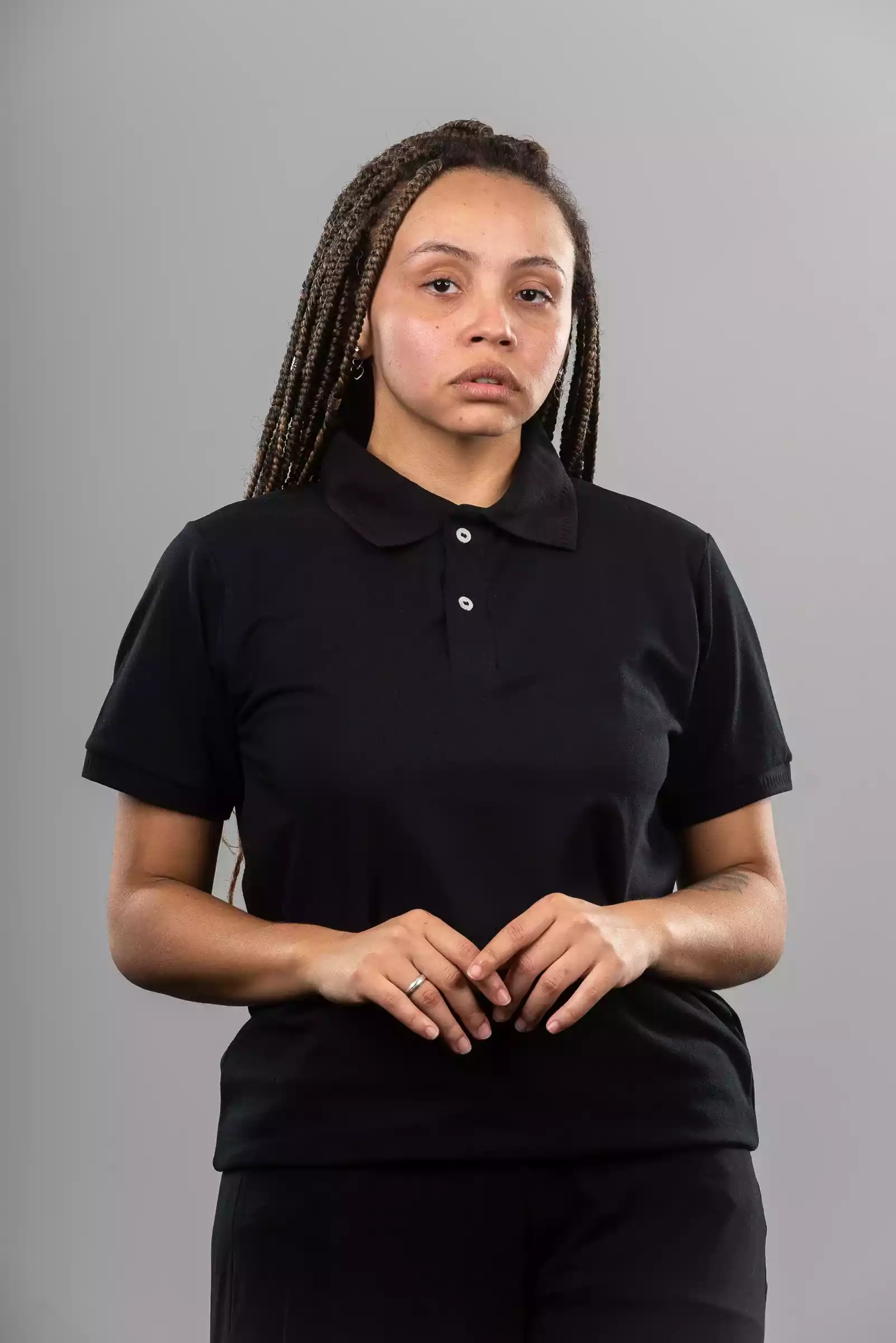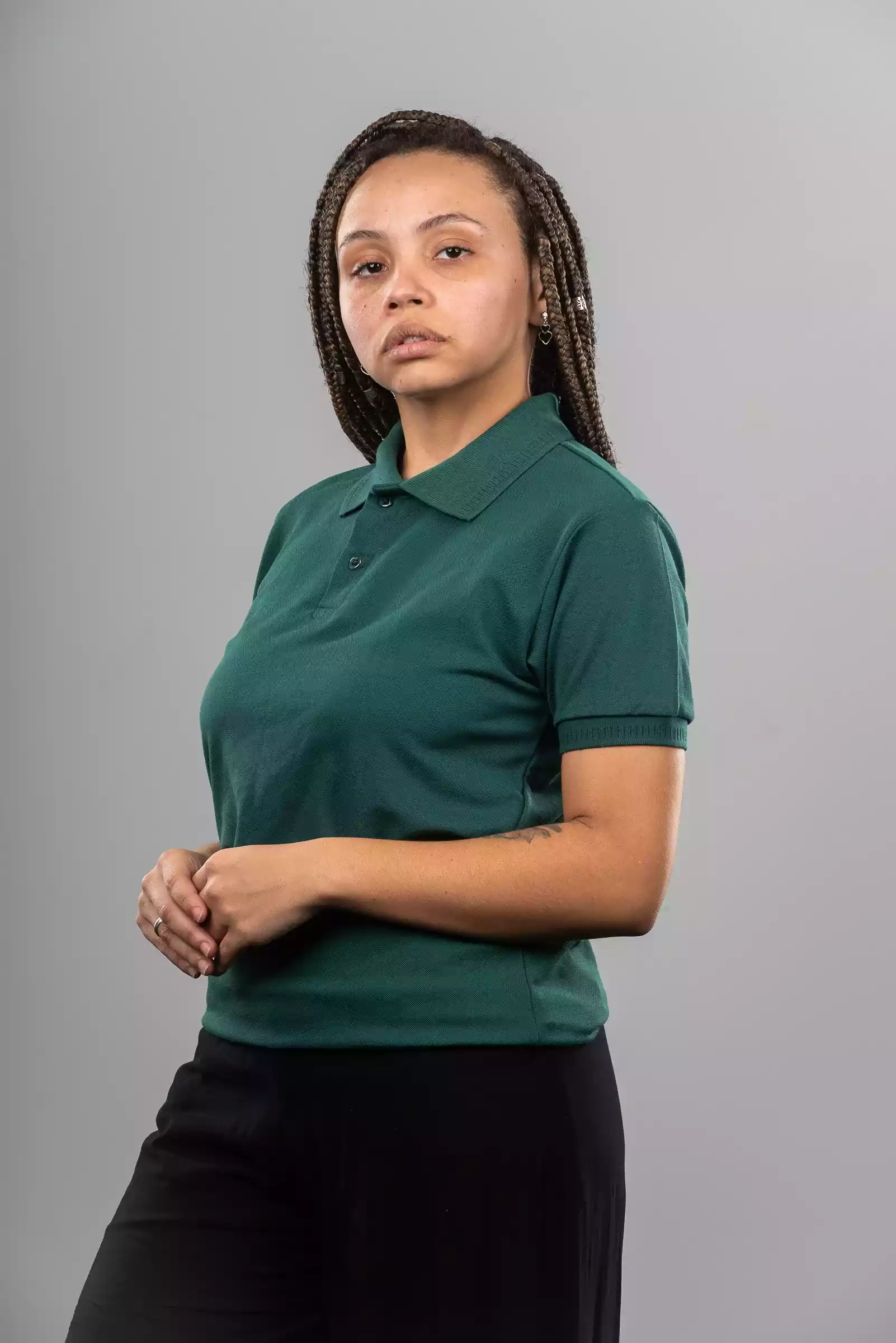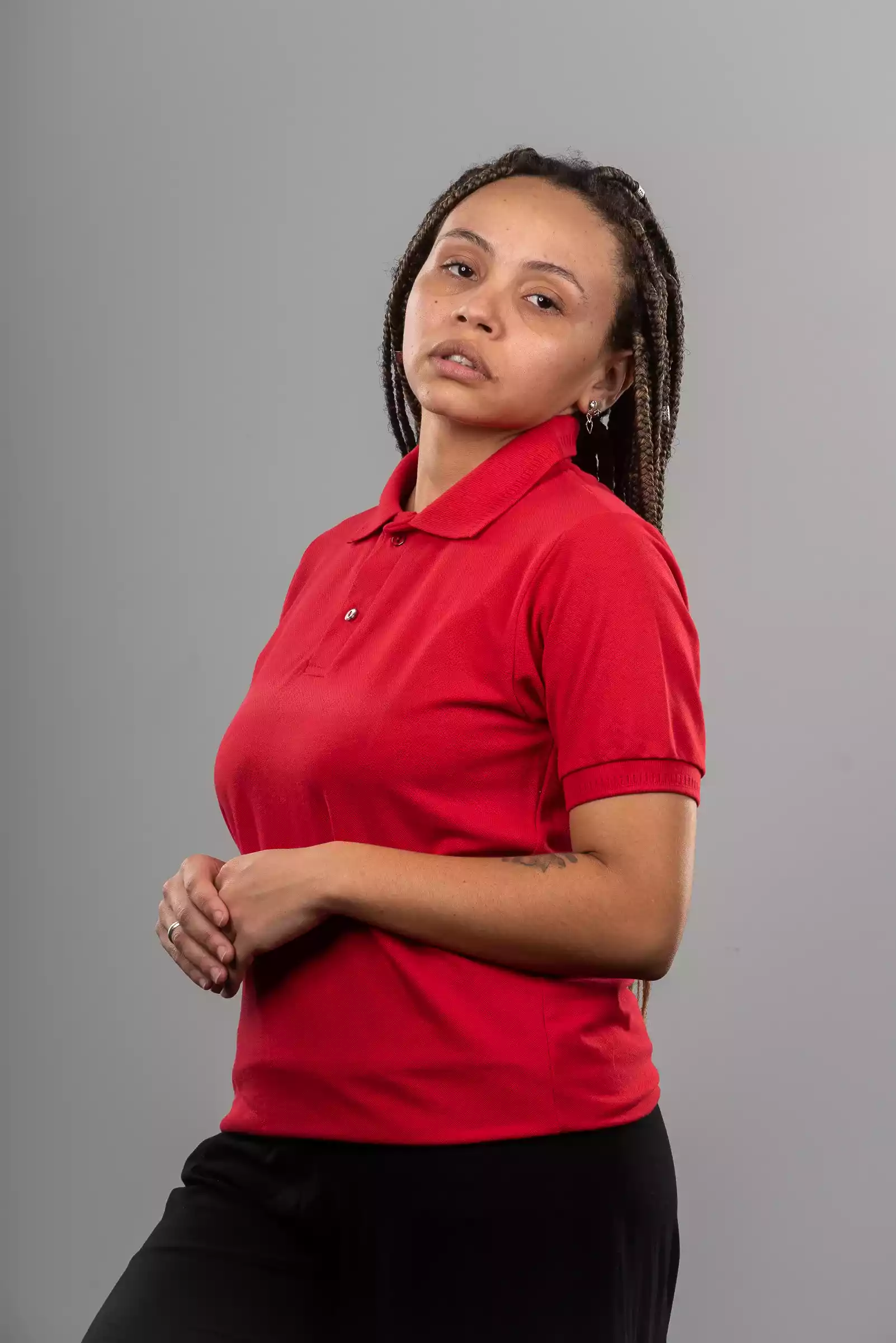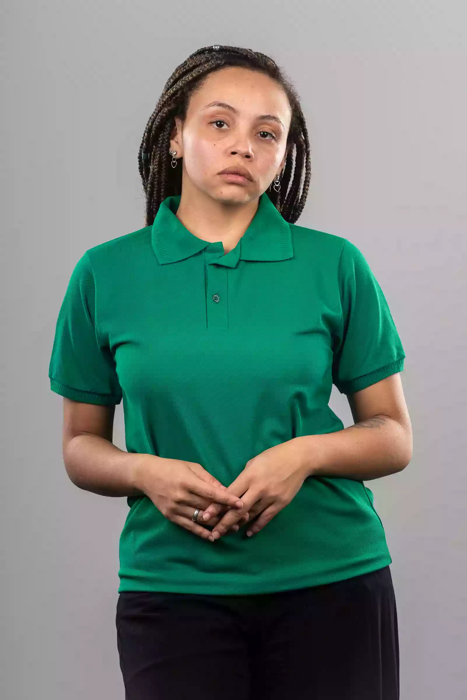 Gola polo basica, malha piquet caiman, manga curta com gola e punho misto.