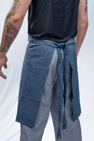 Avental saia básico em tecido jeans leve. Bolso largo frente. Sua logomarca incluso. Faça seu orçamento.
