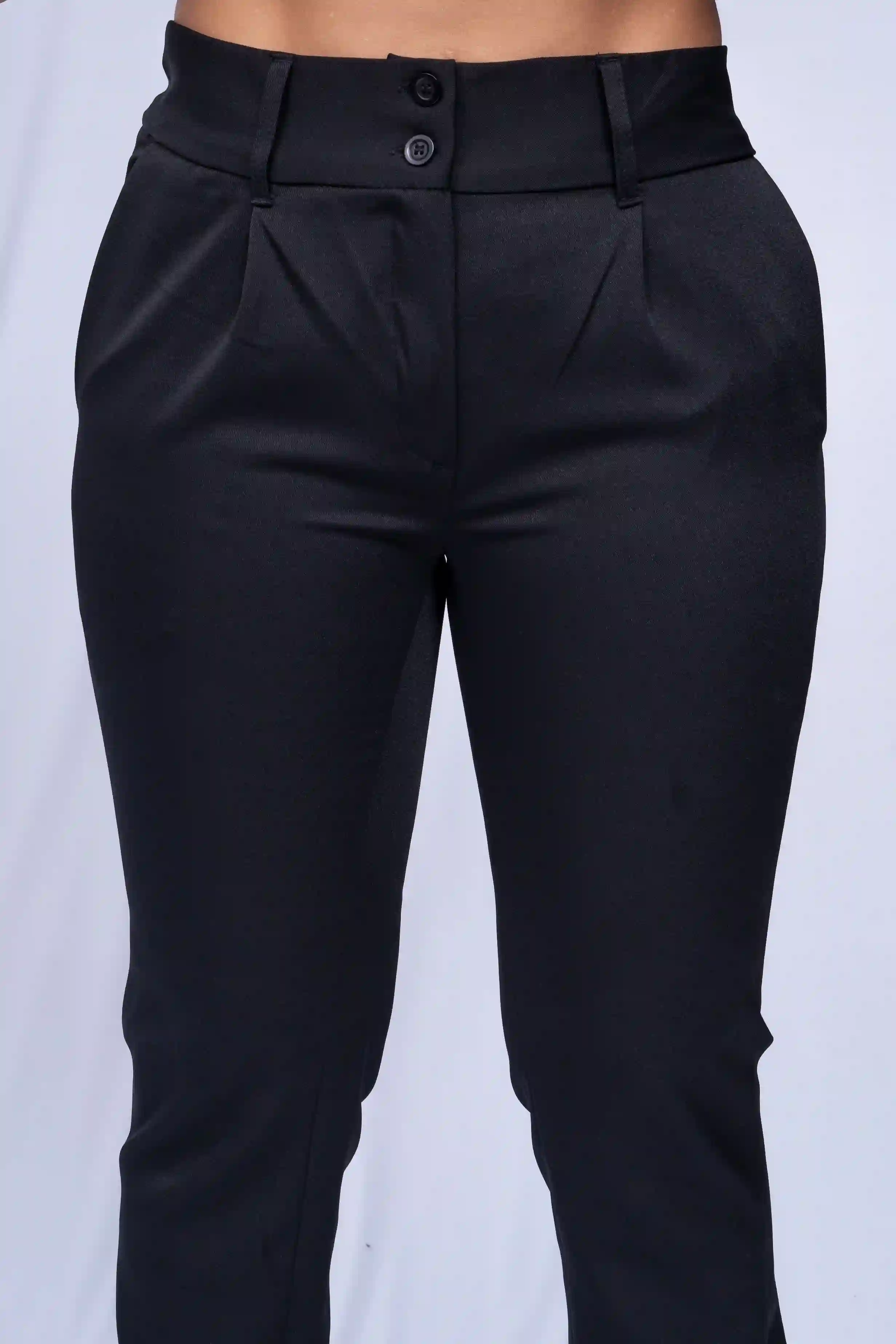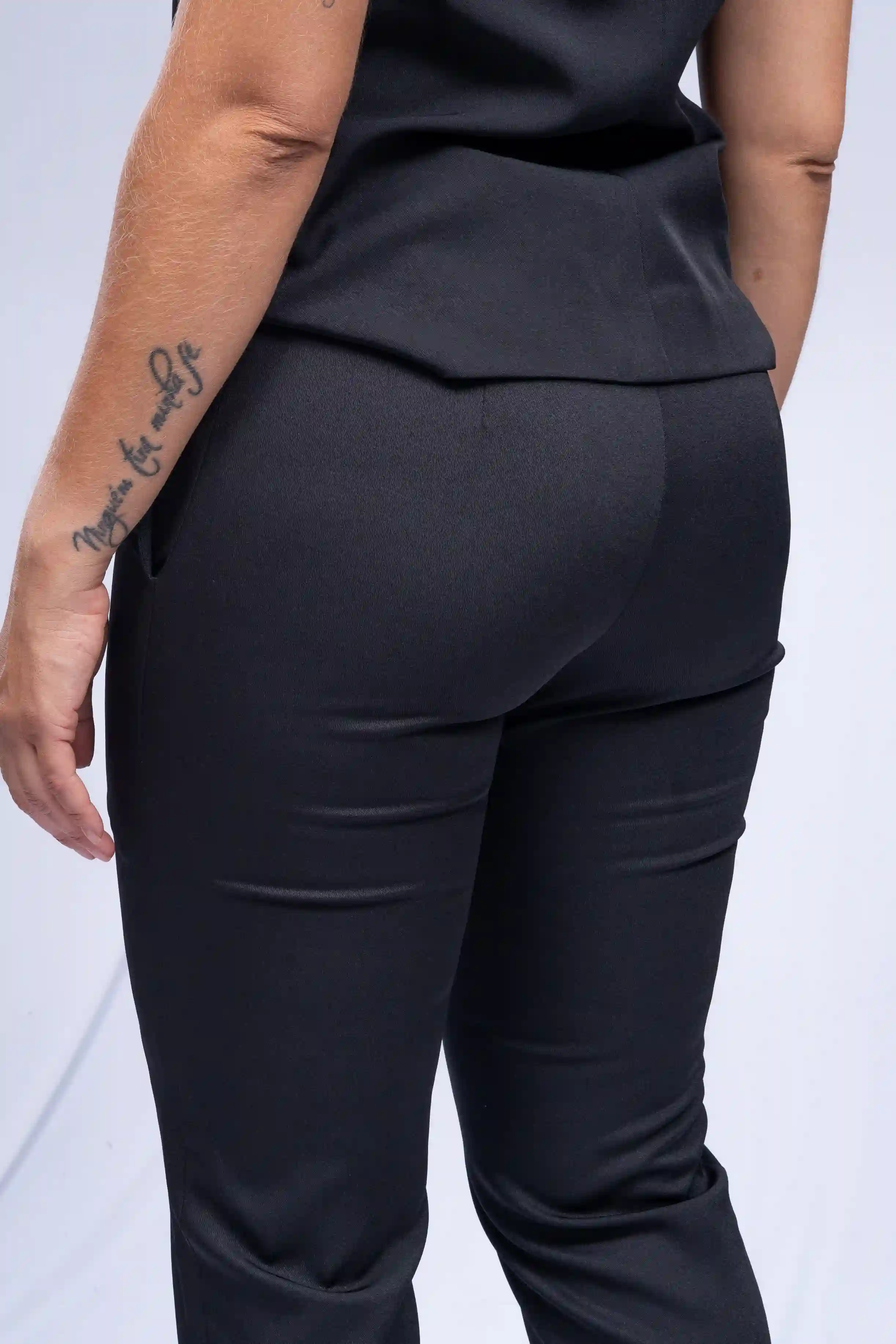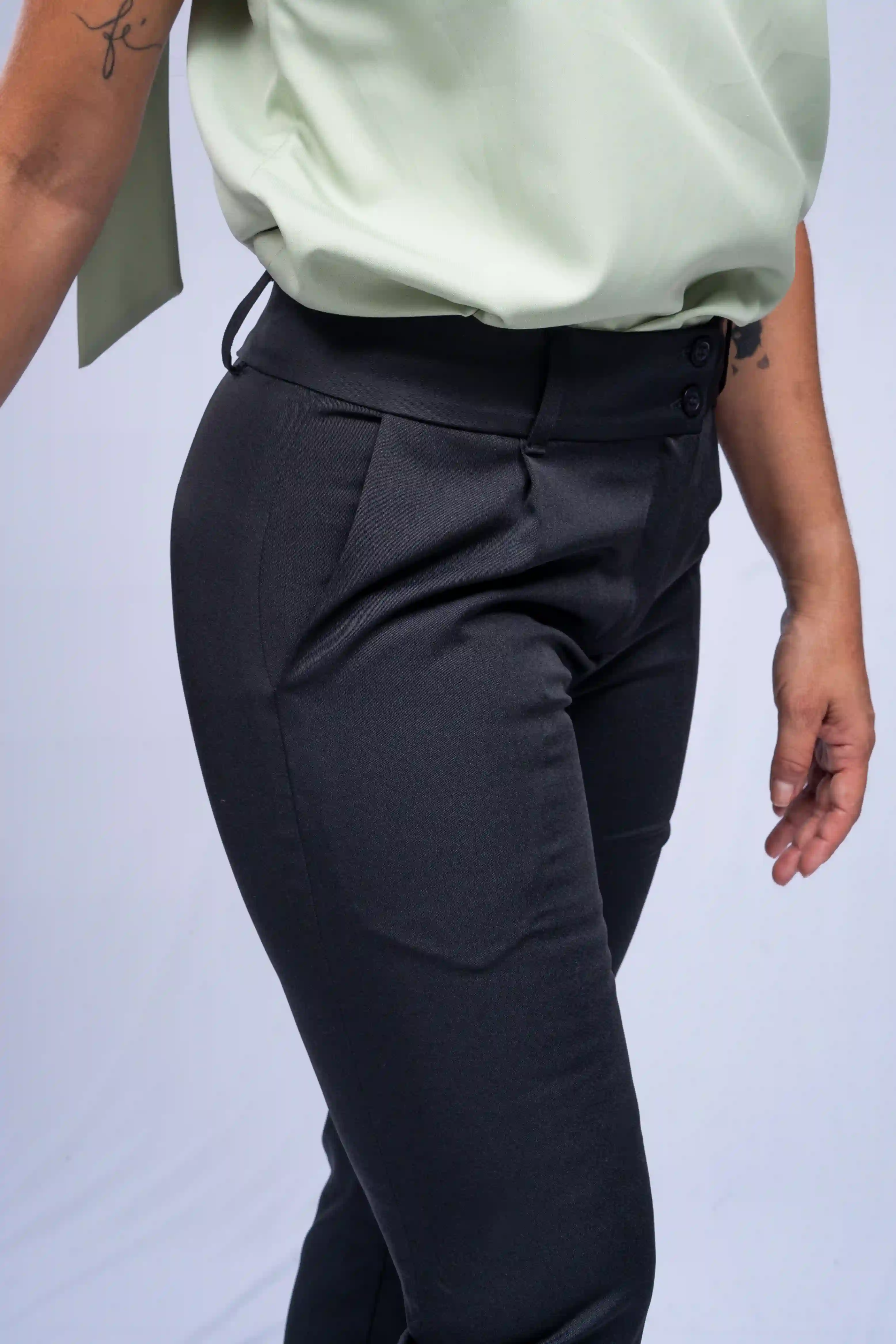 Calça social feminina em tecido twoway poliéster com elastano. Cos alto com zíper e braguilha. Pregas na frente da coxa. Bolso faca frente.