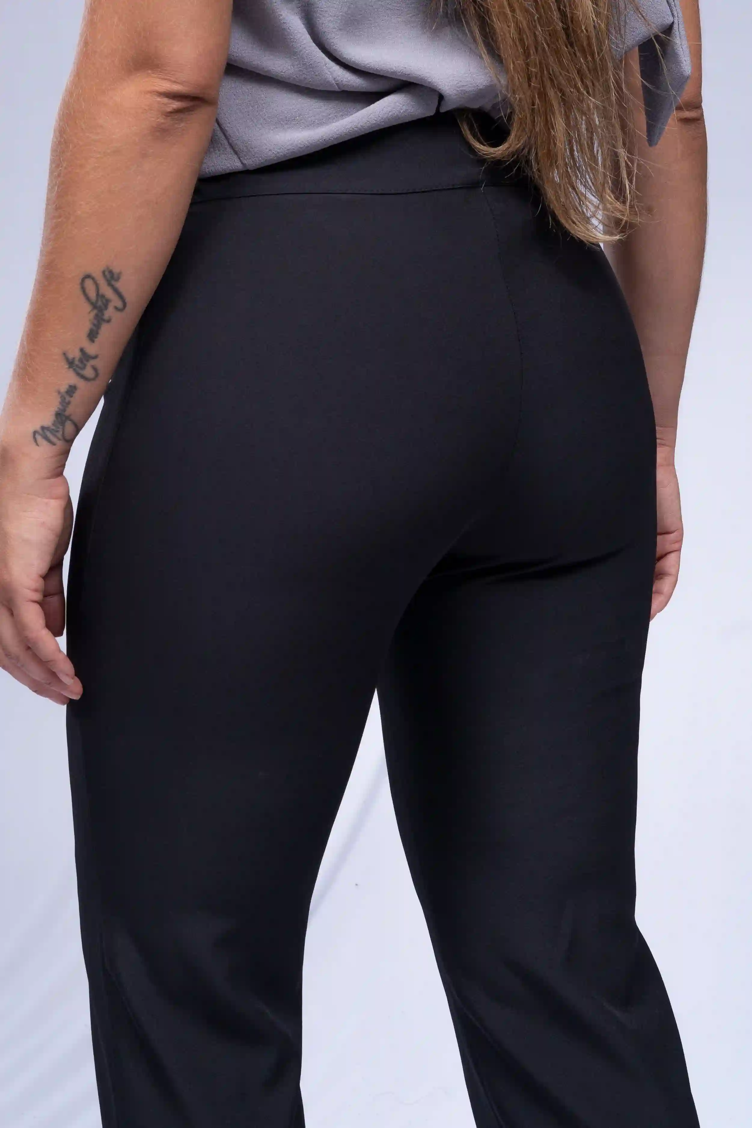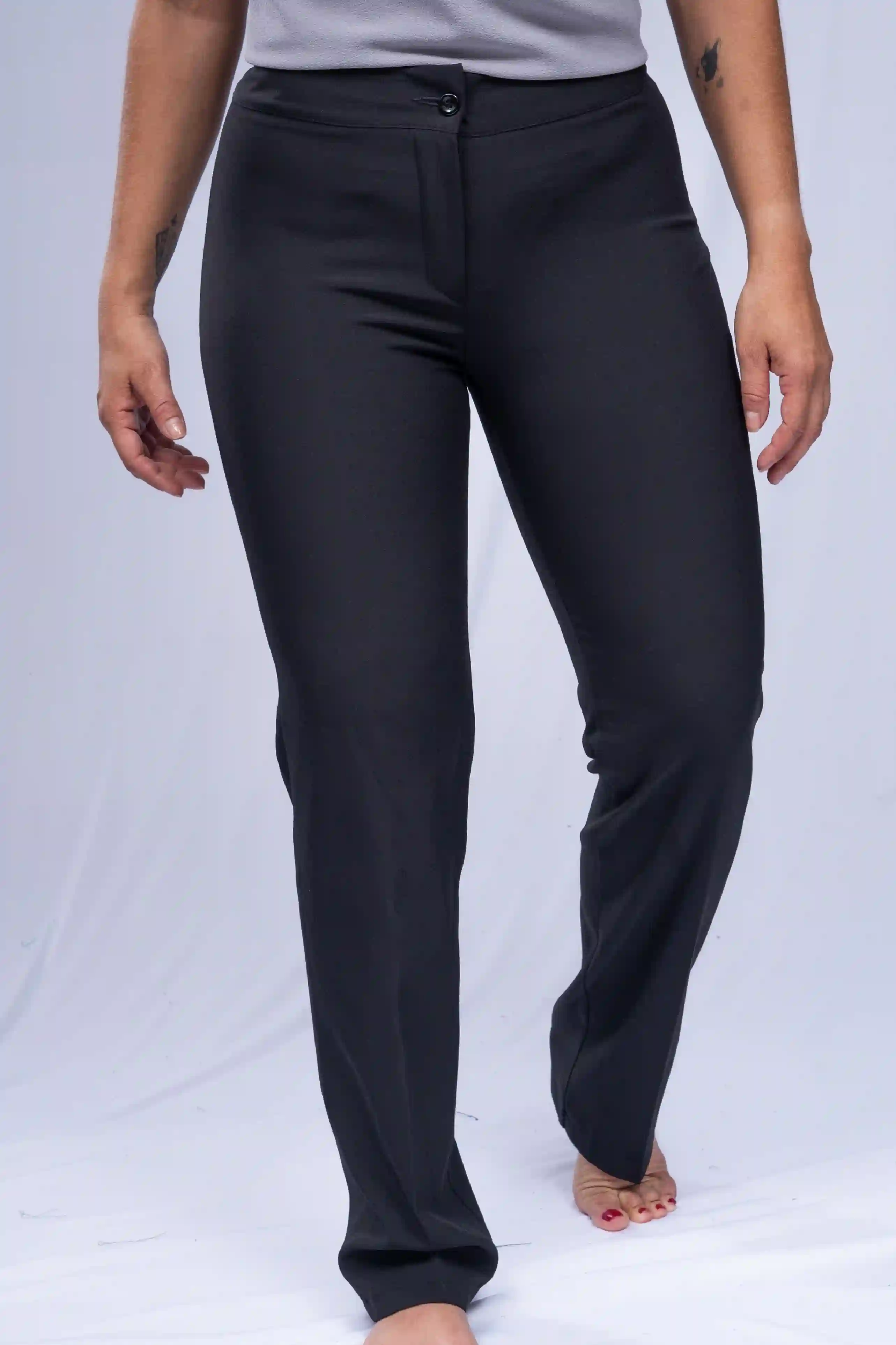 Calça social feminina em tecido twoway poliéster com elastano. Cos alto com zíper e braguilha.