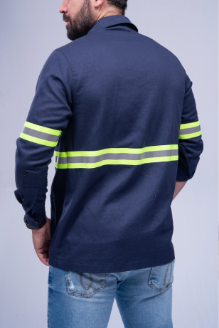 Jaleco personalizado modelo camisa com abertura em botões frente com lapela coberta. Faixas refletivas corpo e mangas. Com 3 bolsos básicos.Sua logomarca inclusa. Faça seu orçamento.